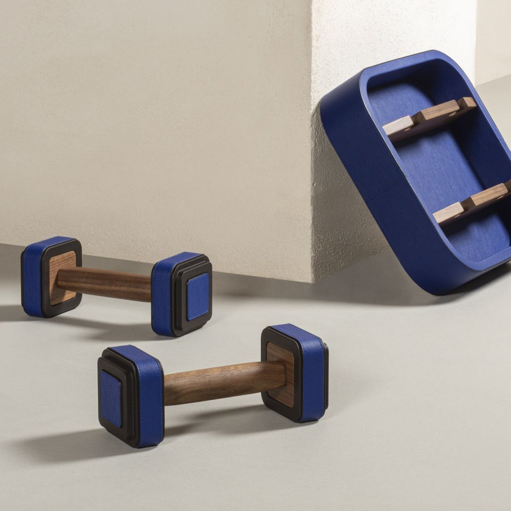 This pair of 2kg weights is designed to be both used for exercises and, when placed in its matching leather-covered holder with fine walnut wood inserts, as a home decor, being a stylish product that can be proudly showcased inside homes. Burnished brushed bronze weights featuring Frau leather inserts and walnut wood grips.