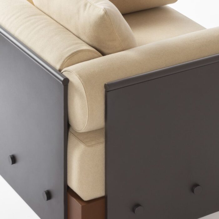 Lacan captivates with its thin and sharp dark bronze frame, a bold outline that artfully envelops massive primal volumes. This juxtaposition of delicate framework and substantial form creates a visual masterpiece that transcends the ordinary. Wrapped by the frame, a fine leather base exudes luxury, while the seat and cushions, dressed in precious fabric, promise comfort beyond compare. Size: 90 x 82 cm – h. 58 cmseat height: cm 40