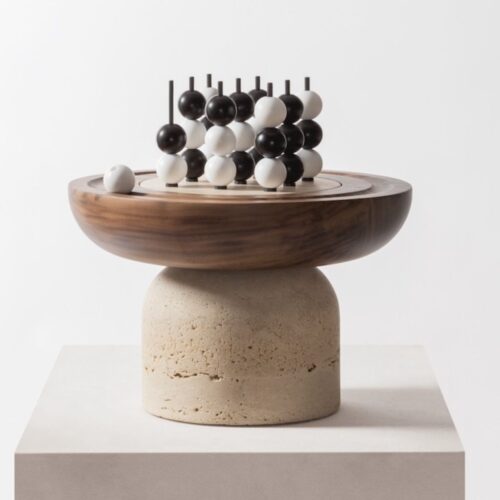 Connection and reflection creations that define everyday landscape. Solid walnut wood structure featuring a printed marble playing field and a fine suede bag containing the playing pieces when not used.