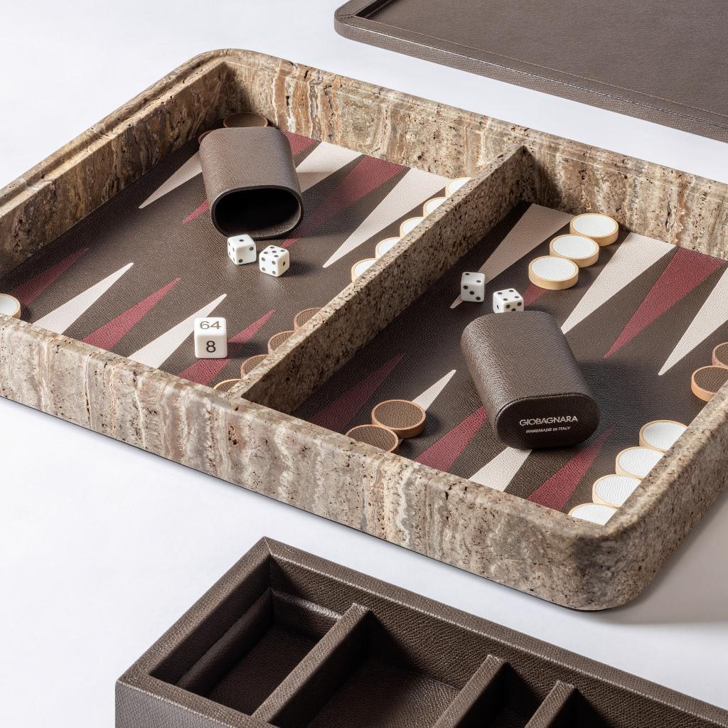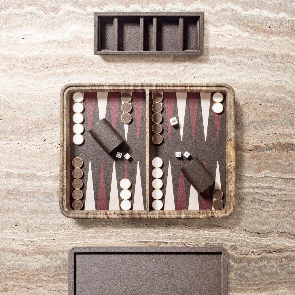 The Rodi backgammon set is conceived as a measured creation where material richness and play unfold through a precise sequence. The travertine box is defined by essential geometry and softened volumes, allowing the stone’s natural depth to emerge with quiet clarity. By removing the leather- covered lid, the inlaid backgammon field is revealed at the base of the interior, transforming the opening into a deliberate moment of discovery.