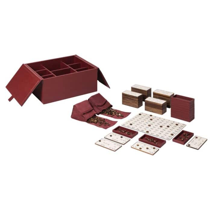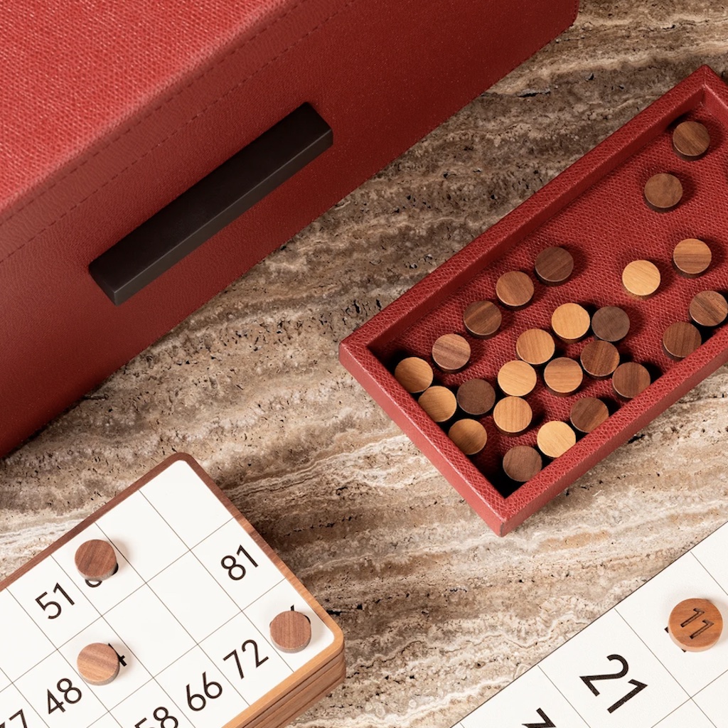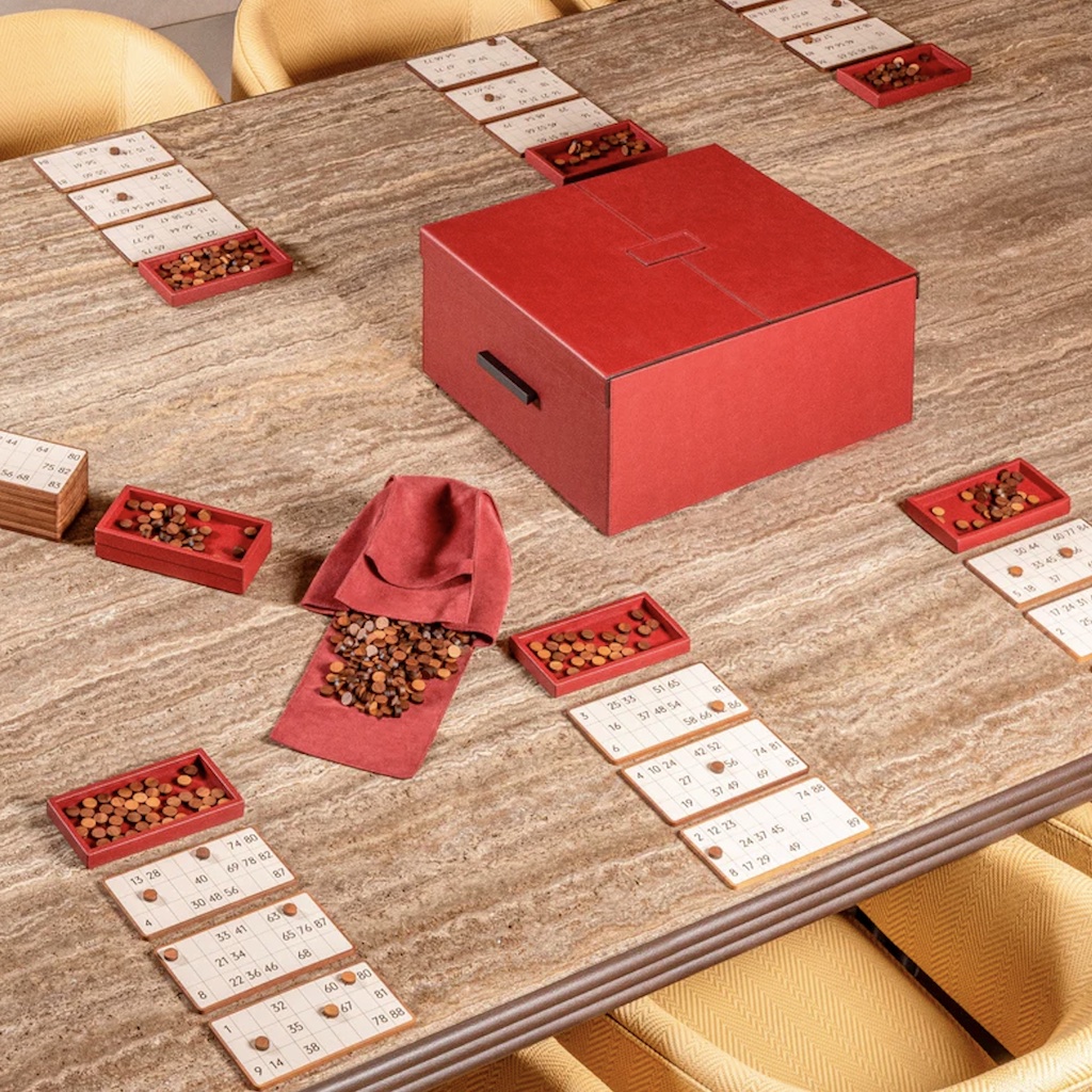 Encased in a leather-covered wooden case with a magnetic closure and metal handles available inthree finishes: chrome, brass, bronze. This bingo game set promises an unparalleled gaming experience, ideal for hosting or gifting with flair. The set includes:• 12 valet trays for seamless organization• 72 walnut wood tablets featuring digitally printedleather inserts• 2 fine suede bags to store two sets of walnut wood chips• 1100 walnut wood placemark chips• 90 numbered walnut wood chips (from 1 to 90)• 1 digitally printed leather board with numbers from 1 to 90size: 50 x 37 cm – h. 21,5 cm