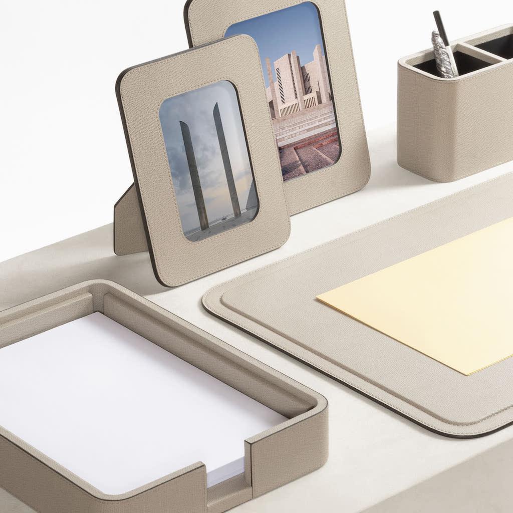 The iconic polo shape with rounded corners is now declined into a collection of desk accessories. All the pieces of this collection feature a wood structure preciously covered with the finest italian leather, whose natural charm i fully enhanced by these creations’ minimal geometric line. Size: 14. 5 x 14,5 – h. 6 cm
