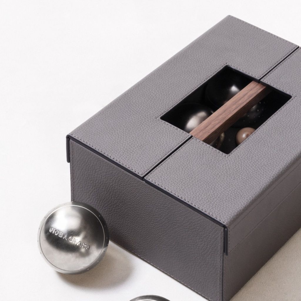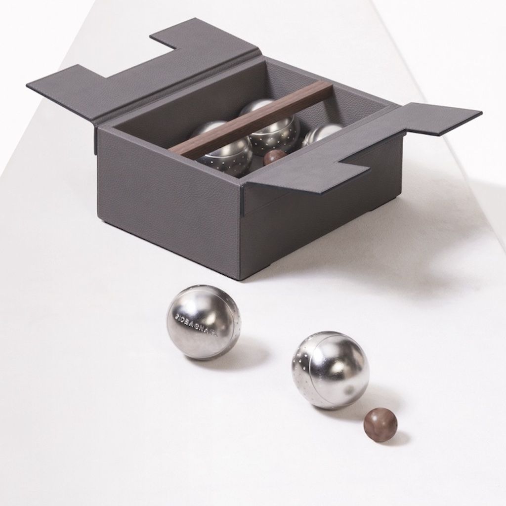 A classic mediterranean pastime, this pétanque lawn bowling is presented in a precious leather covered wood case with a solid walnut wood handle. Includes a set of six stainless steel balls and two wooden jacks that serves as target balls.