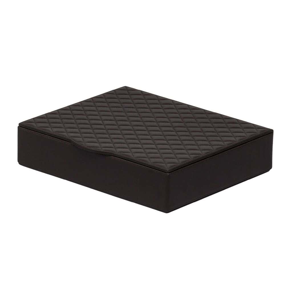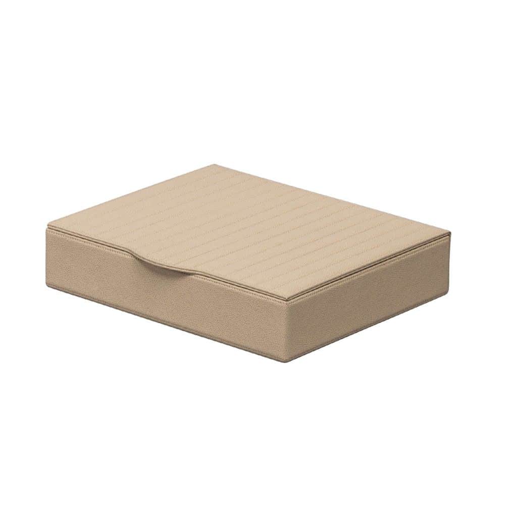 Leather covered wood structure with hinged lid. Comes with a plexiglass panel able to host 30 nespresso capsules. Size: 26×30 – h. 6,5 cm