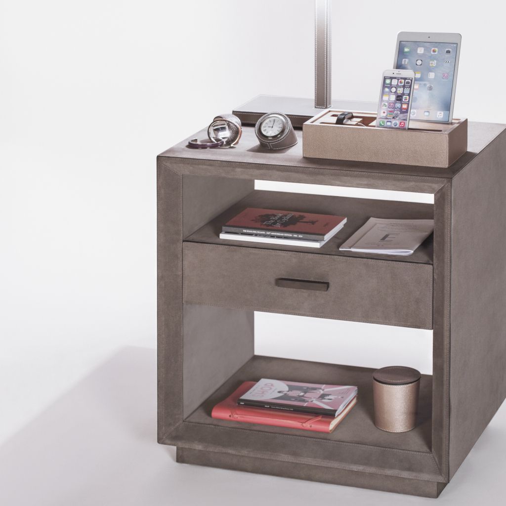 Leather covered wood cabinet. Special soft-closing drawer with removable suede lining. Bronze handle. Size: 40 x 44 cm h. 55 cm