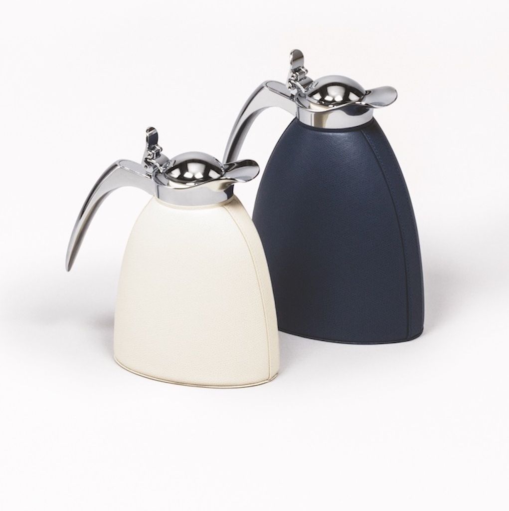 Partially leather covered insulated brass carafes with chrome-plated finish. Two-chamber stainless steel structure able to maintain liquid’s warm temperatures for up to 12 hours and cold temperatures for up to 24 hours. Precise pouring thanks to the specially developed hinged lid with one-hand operation.