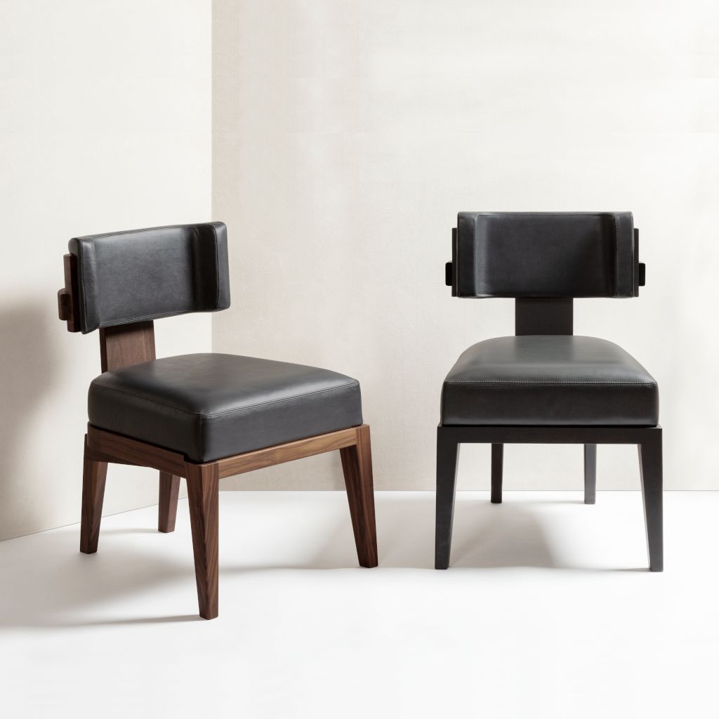 Materials: canaletto walnut wood structure with upholstered leather cushions. Choose between two available wood finishes. Size: 62 x 52. 5 cm – h. 77 cm – seat height: 46 cm