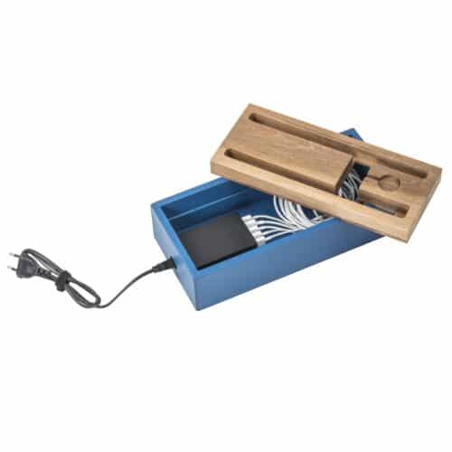 This multi device charging station hosts a high quality 5 port usb charger able to recharge 5 devices simultaneously and provide clear view. A wireless certified qi standard charger, adopted by the largest mobile devices manufacturers, in integrated on the wooden top and dressed up in leather to march the color of the wood. Size: 31,5 x 18,5 cm – h. 8 cm