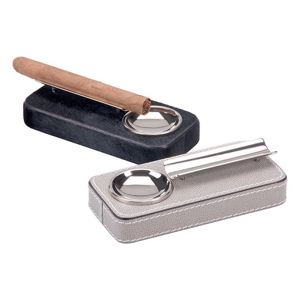 Handcrafted wood base covered in leather. Basin and cigar holder in metal chrome.