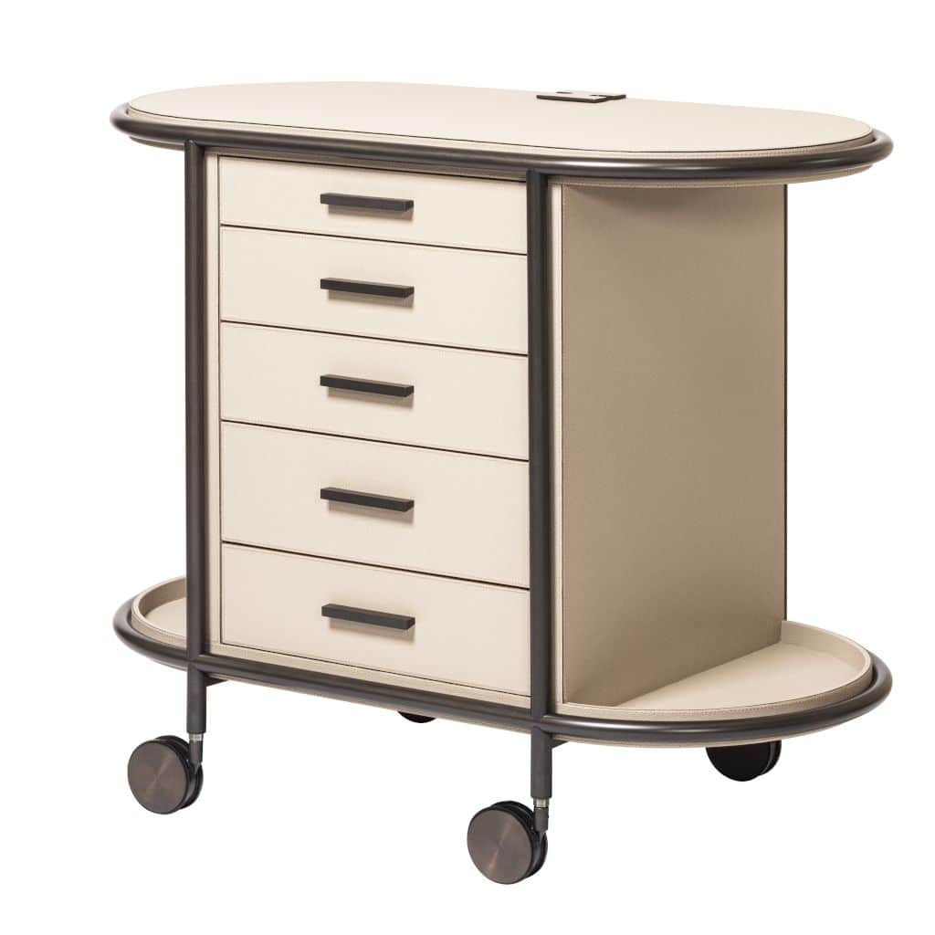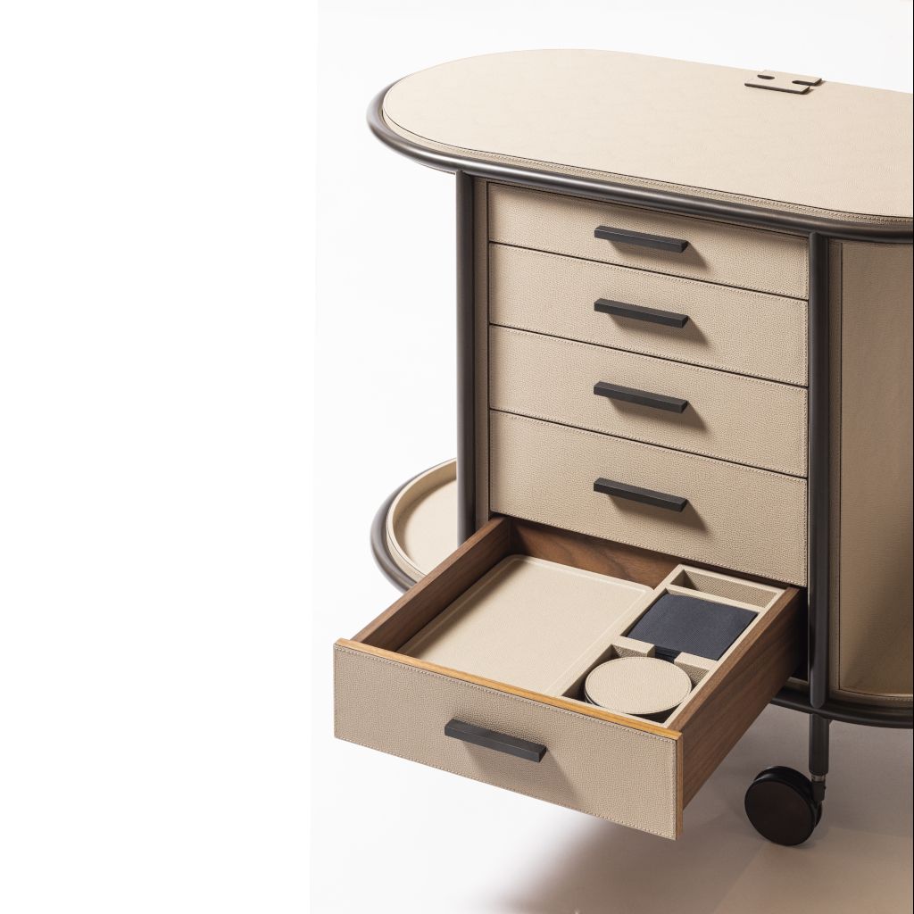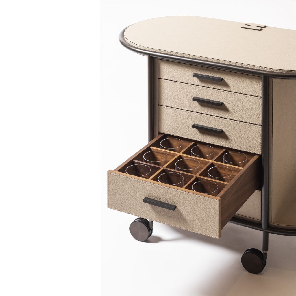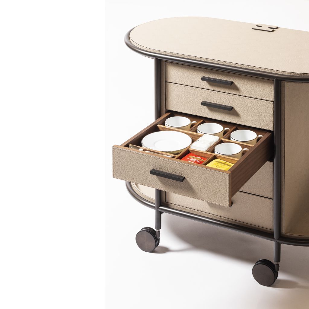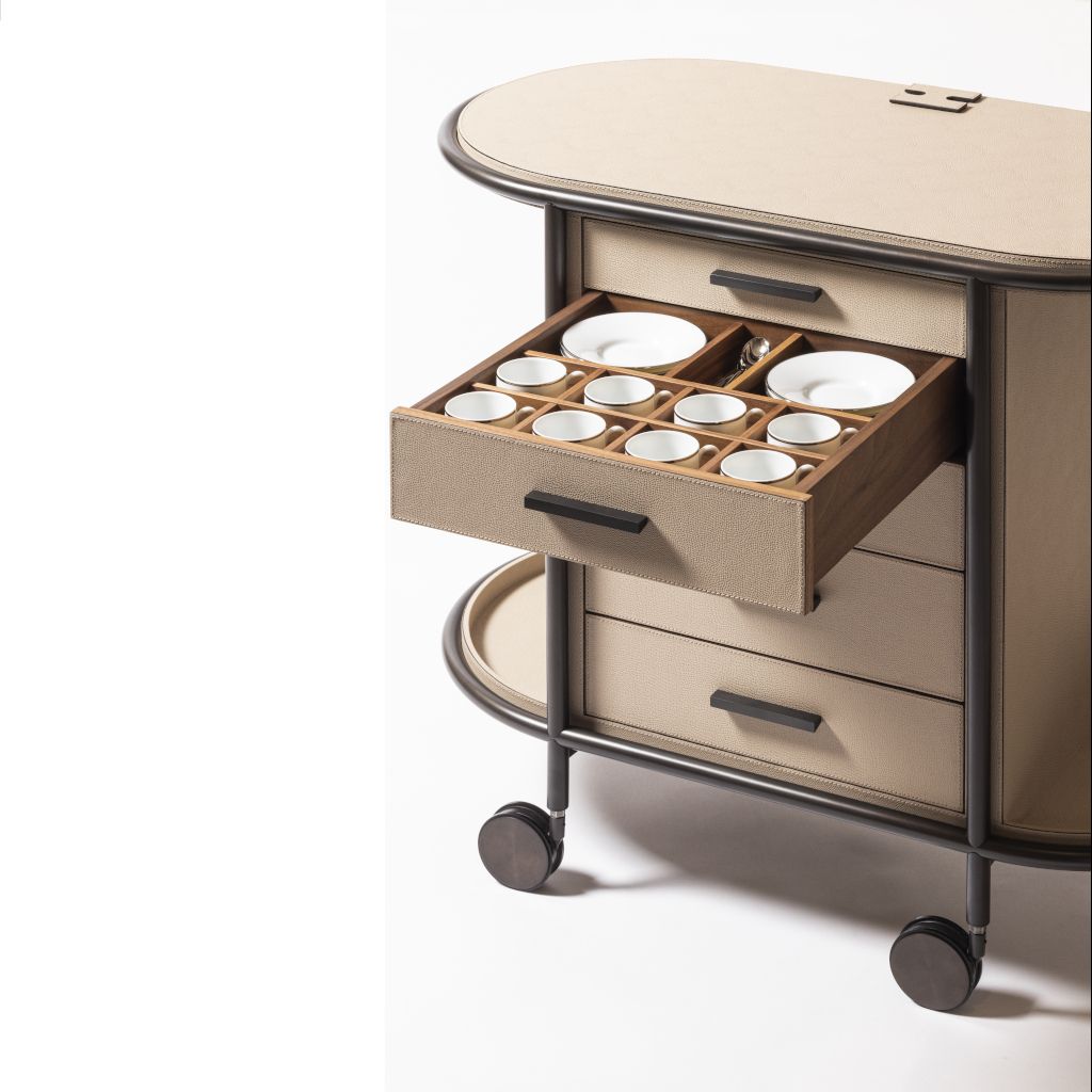 Featuring a leather-covered four-wheel wood structure, a metal frame and wheels available in three finishes: chrome, brass, bronze. This refined tea and coffee cart is the epitome of functionality and sophistication. With five organized drawers with sleek metal handles, it provides ample storage for coffee capsules and tea bags, ensuring everything is within reach. Included with the cart is a luxurious set of porcelain coffee and tea cups with matching plates, adorned with a delicate silver graphic trim. Complementing this are leather service trays and coasters, adding a touch of understated elegance. Designed with mobility in mind, this furniture piece on wheels effortlessly combines style and practicality. Perfect for storing all your tea and coffee essentials, it’s an elegant solution for both everyday use and special occasions.
