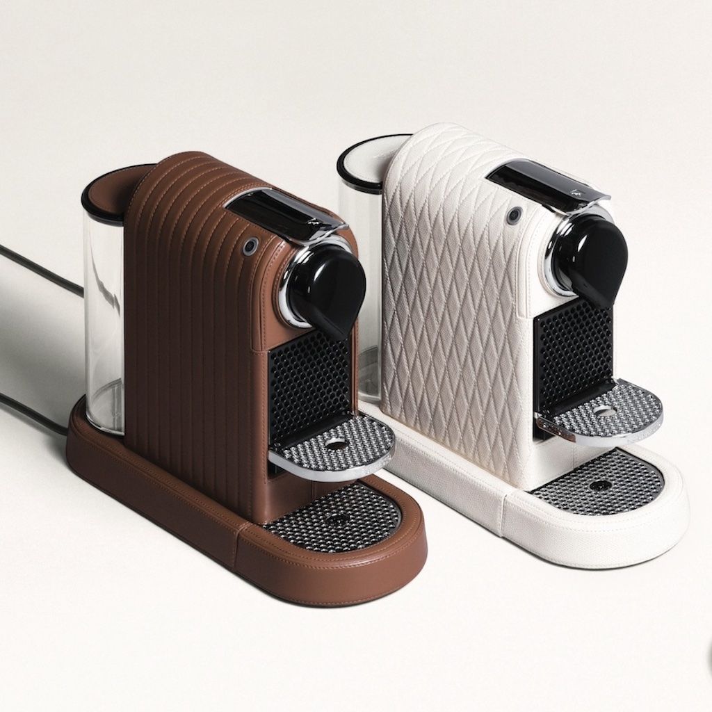 Original Nespresso machine covered in leather with a diamond or straight lines quilt pattern.