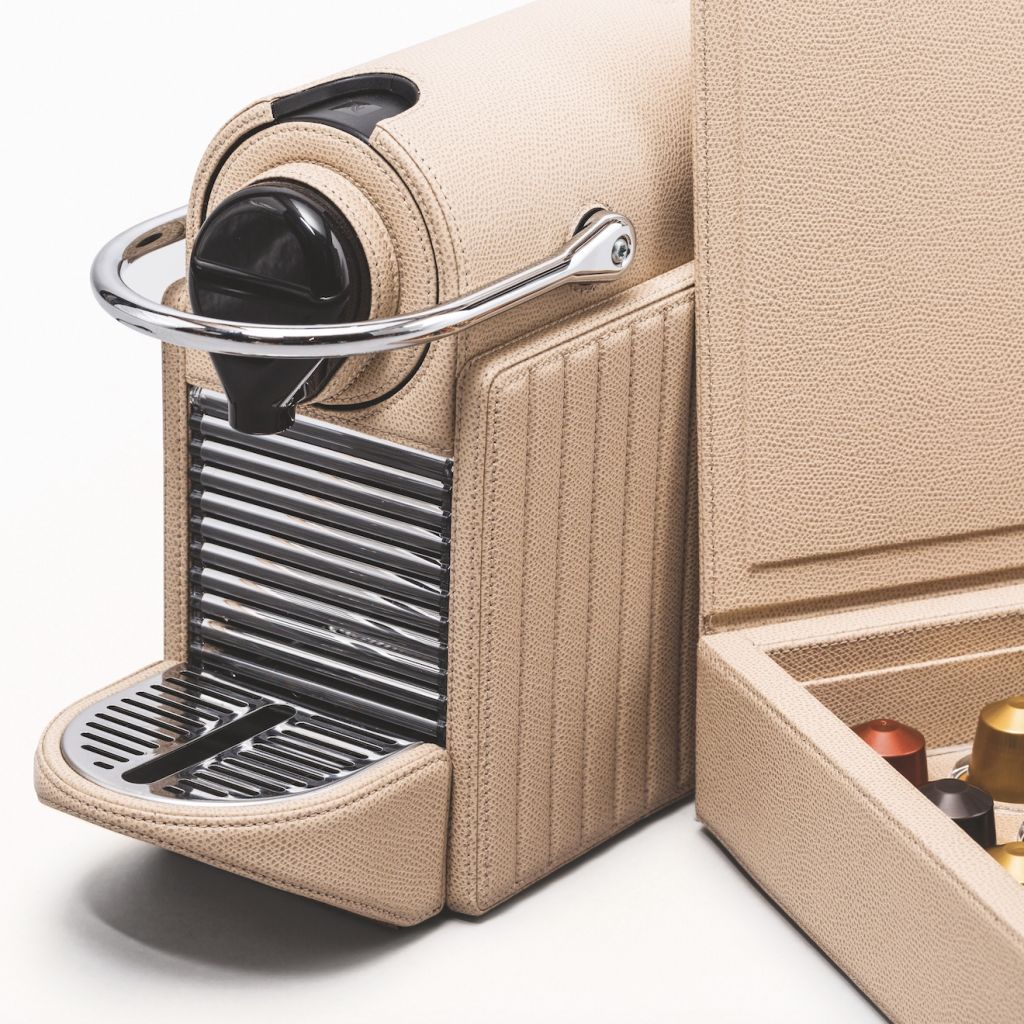 Original Nespresso machine covered in leather with a diamond or straight lines quilt pattern.