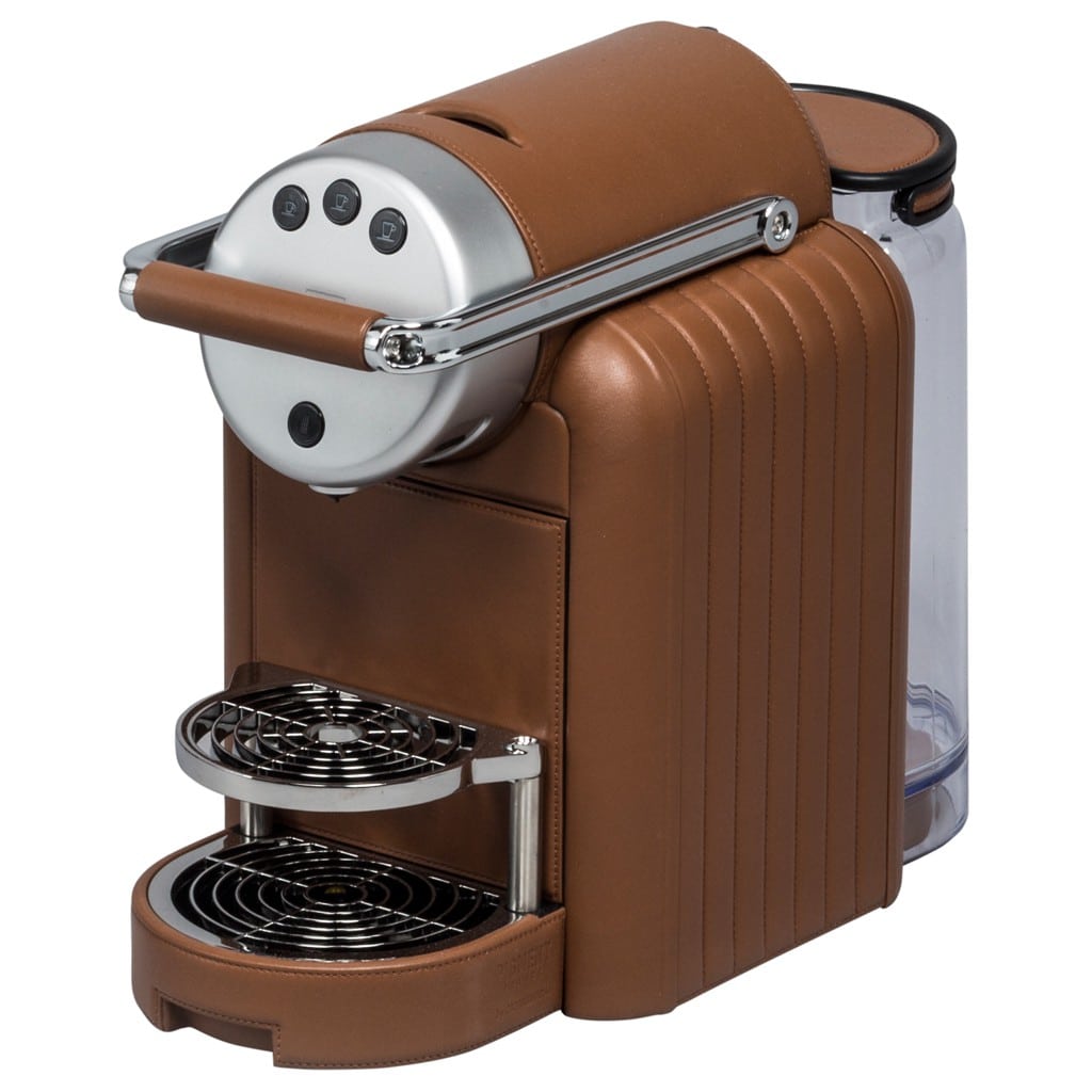 Original nespresso machine covered in leather with a diamond or straight lines quilt pattern. It uses commercial nespresso capsules and includes the possibility to pour just hot water.