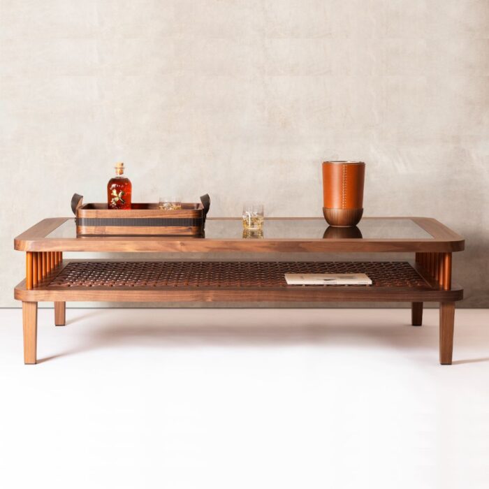 Between classic elegance and modern restraint, the Toiles de Noyer coffee table pairs a walnut wood structure with a lower level in handwoven saddle leather, where the intricate weave lends depth, texture, and artisanal richness. Above, held by slender saddle leather pillars, a tempered glass top, available in a bronze-colour or transparent finish, glows with refined clarity, framed by walnut wood. Rounded corners and squared legs create a subtle tension of lines,