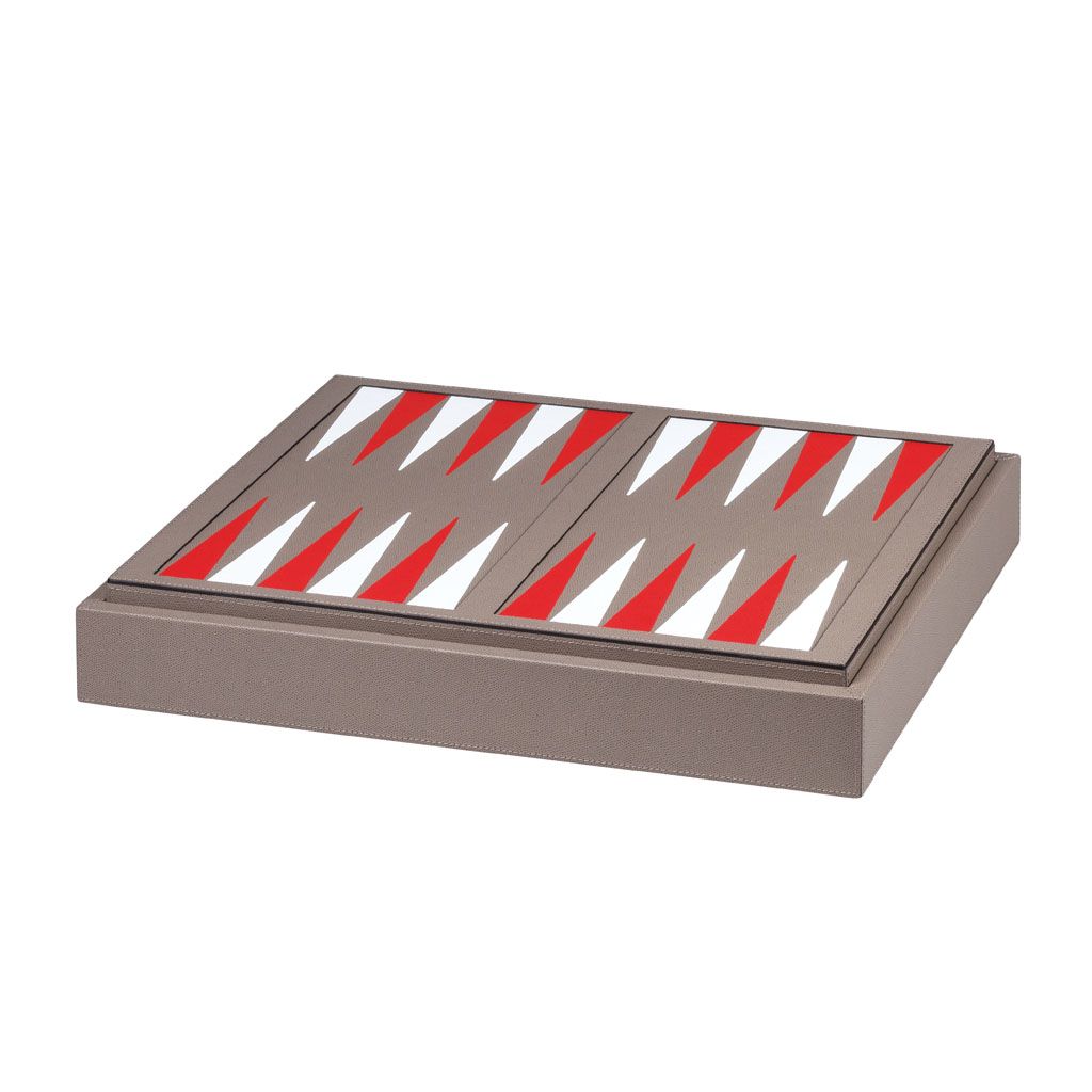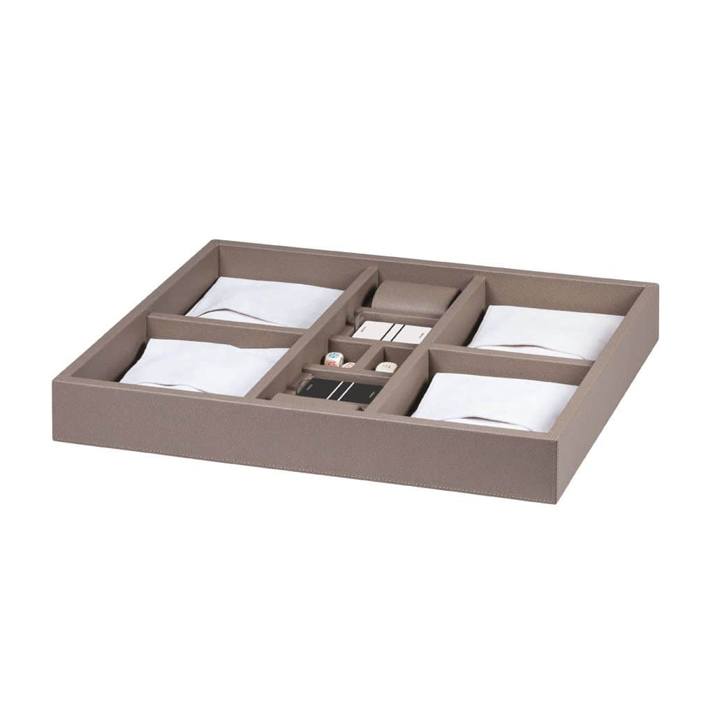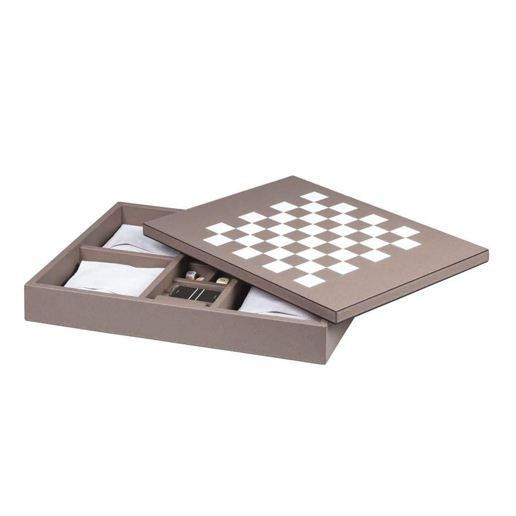 Leather covered wood structure. Includes boxwood chess, boxwood draughts, bakelite dominos, 2 decks of high quality playing cards, 2 dice cups, 5 standard dices and 5 poker dices.