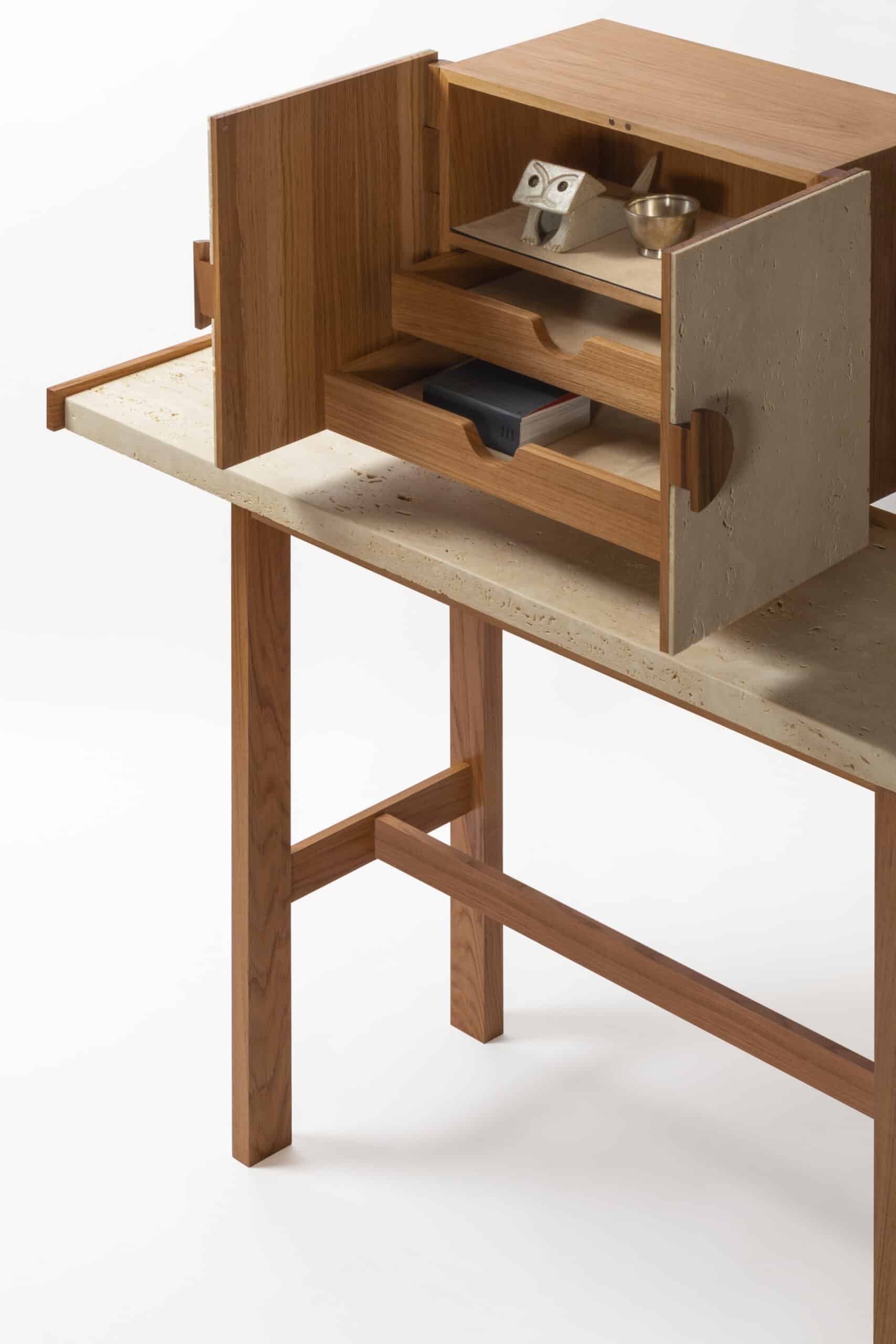 combining a massive-looking travertine top with a slim oil-finished walnut wood structure.