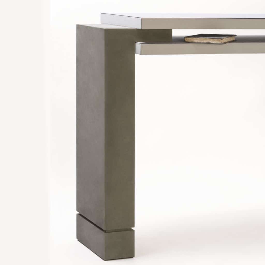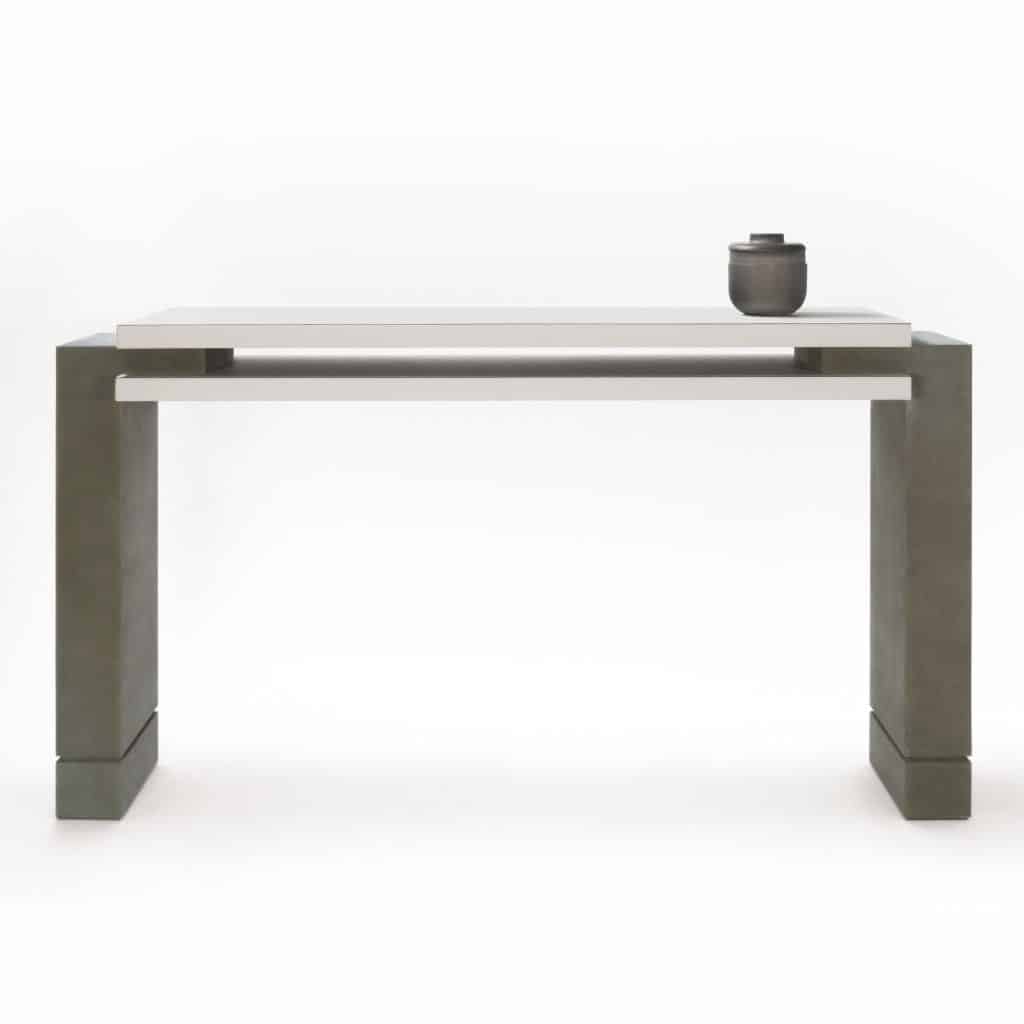 The cubic minimal shapes of this line of furniture create a contrast with the refined precision of crafstmanship. As a neobrutalist architecture, designed with recurrent modular volumes, these tables, consoles and desks, feature and convey a sense of immutability that makes them particularly attractive in our chaotic and crumbling world. Size: 165 x 40,5 cm – h. 91cm
