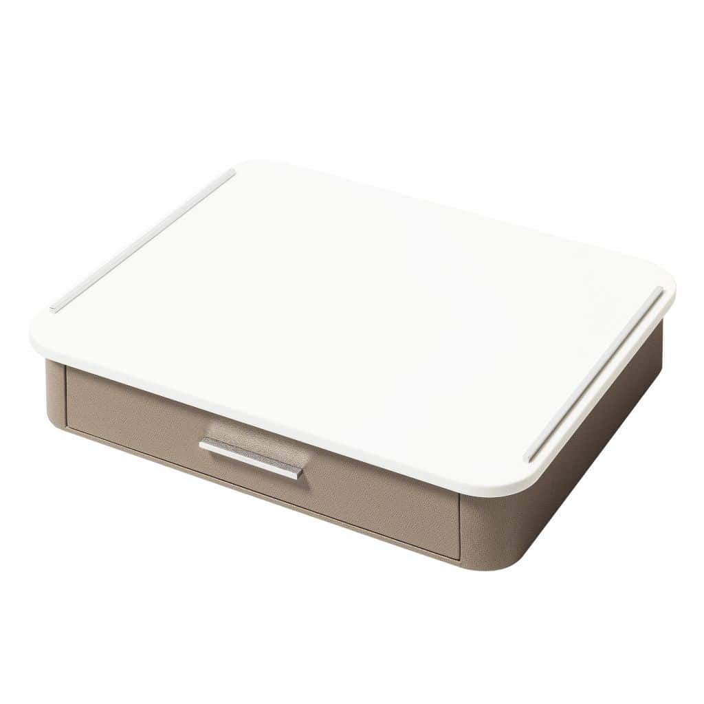 Leather-covered wood structure, top in corian with metal inserts available in three finishes: chrome, brass, bronze. The drawer features inner walnut wood partitions to host coffee spoons, sugar, 24 nespresso classic capsules, 6 double-wall borosilicate glass cups (included) and 6 nesting rectangular saucers (included). Size: 50,5 x 42 cm – h. 11 cm