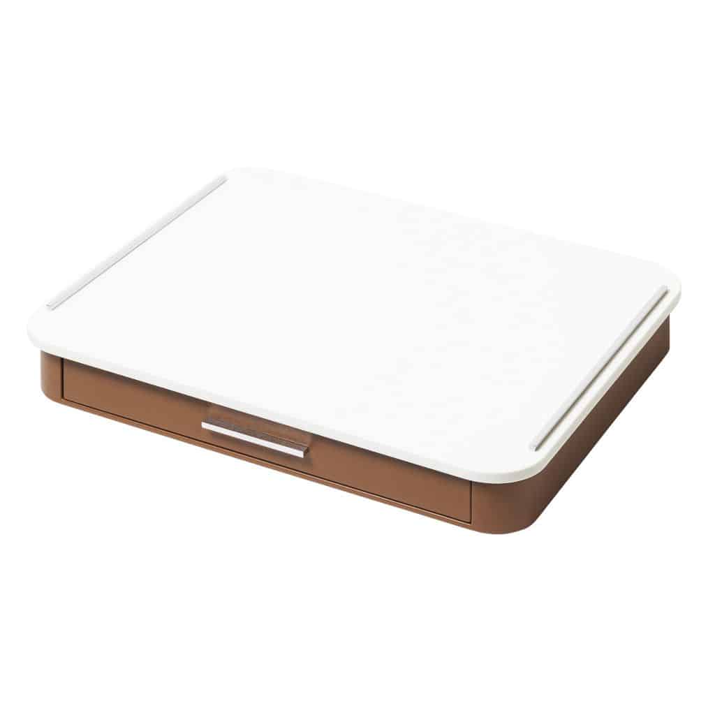 Leather-covered wood structure, top in corian with metal inserts available in three finishes: chrome, brass, bronze. The drawer features inner walnut wood partitions to host coffee spoons, sugar, 24 nespresso professional capsules and tea bags. Size: 50,5 x 42 cm – h. 8,5 cm
