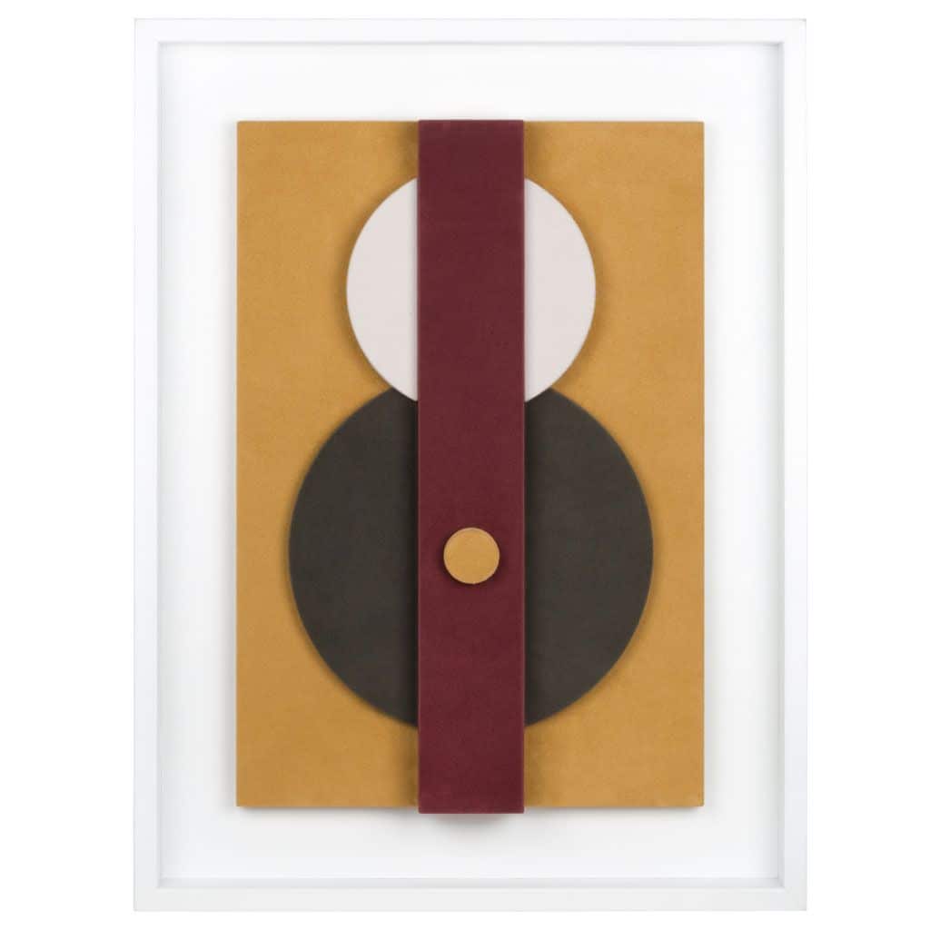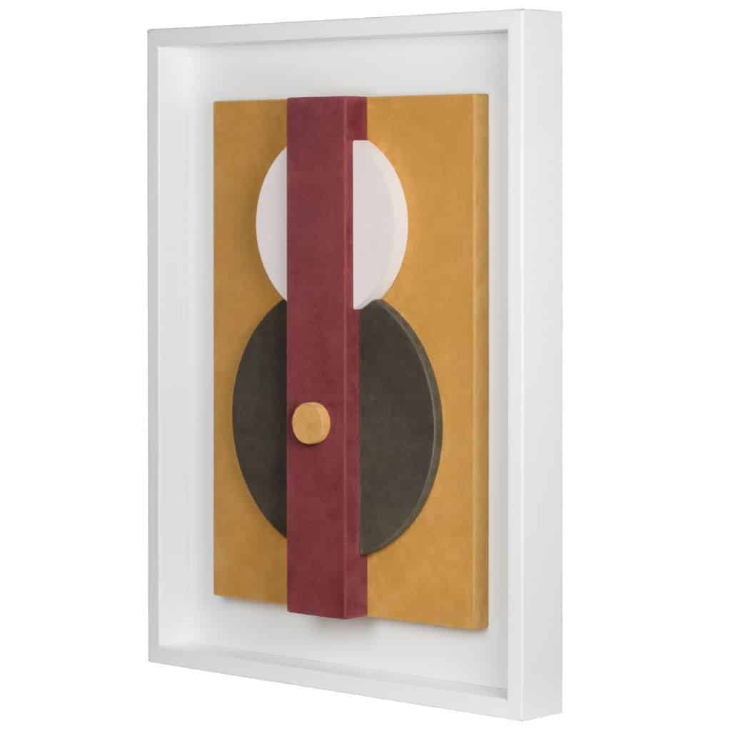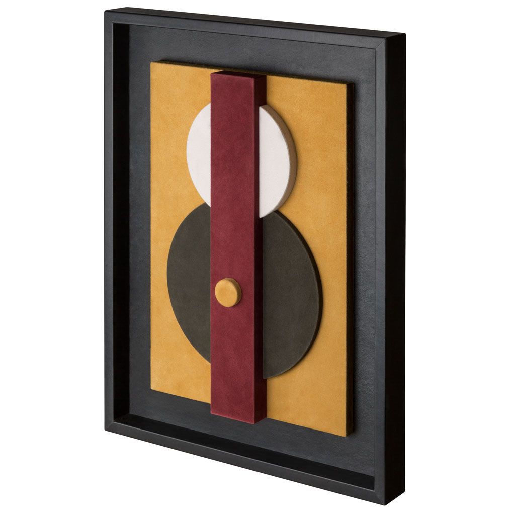 This suede-covered wall sculptures are framed in nappa. The interaction between colors and shapes make them decorative pieces based on pure geometry, where abstraction and figuration create formal structures that allow color to dominate. Frame: black or white nappa leather. Size: 46. 5×61,5 cm – depth 7 cm