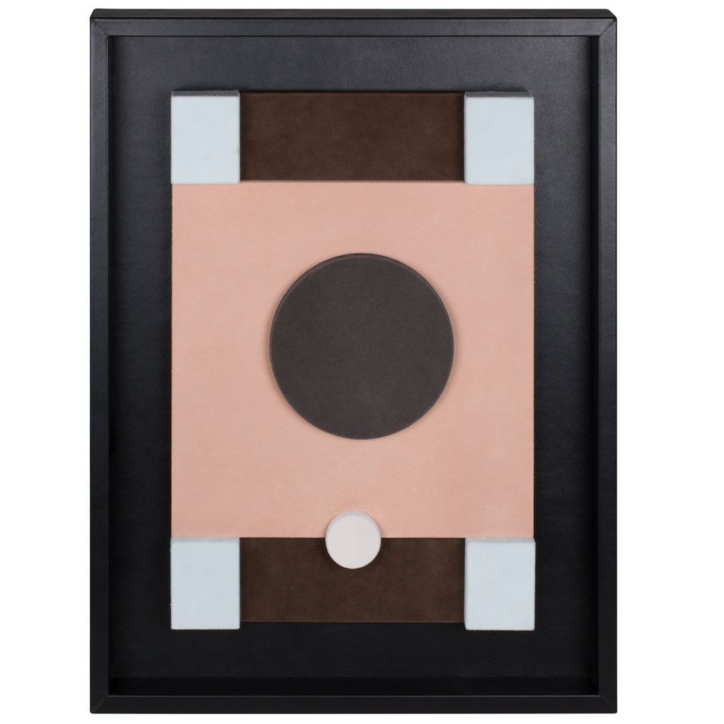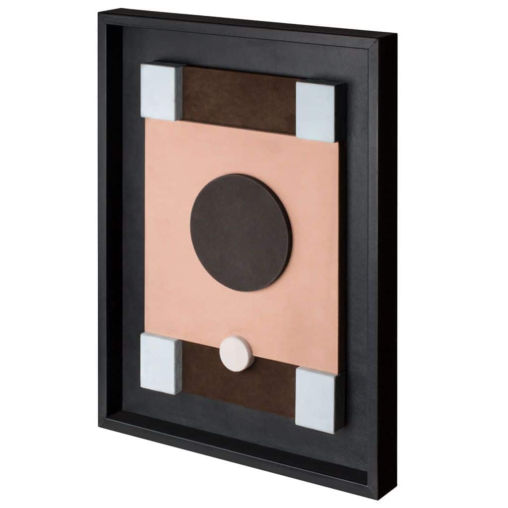 This suede-covered wall sculptures are framed in nappa. The interaction between colors and shapes make them decorative pieces based on pure geometry, where abstraction and figuration create formal structures that allow color to dominate. Frame: black or white nappa leather. Size: 46. 5×61,5 cm – depth 6 cm