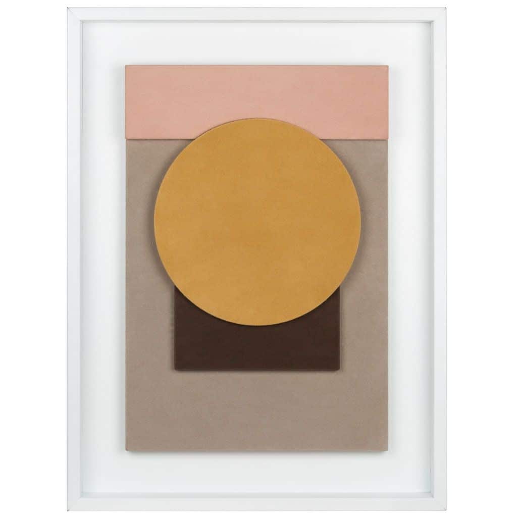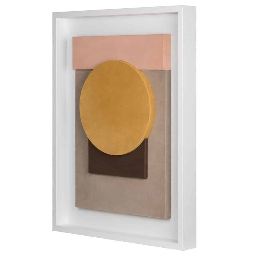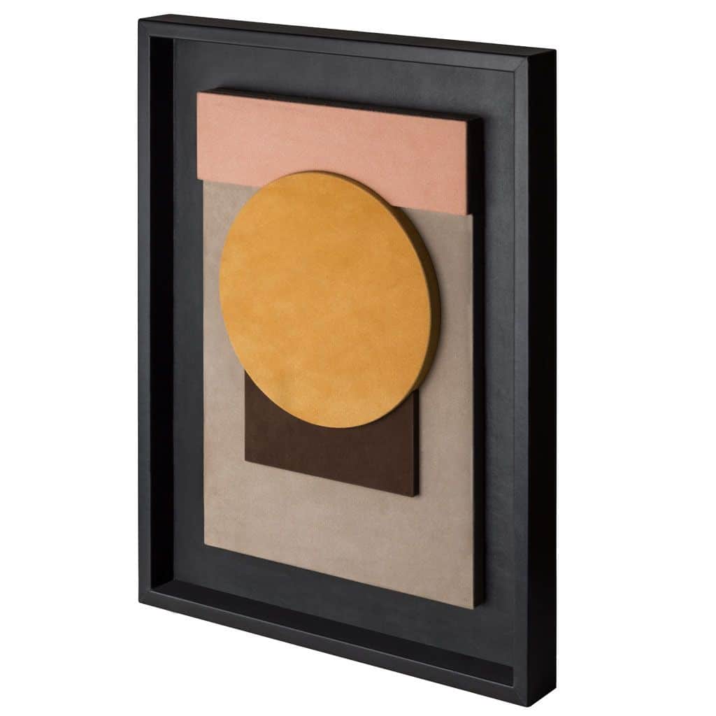 This suede-covered wall sculptures are framed in nappa. The interaction between colors and shapes make them decorative pieces based on pure geometry, where abstraction and figuration create formal structures that allow color to dominate. Frame: black or white nappa leather. Size: 46. 5×61,5 cm – depth 6 cm