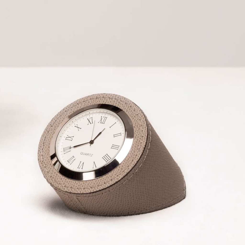 Desk watch made with real calf skin leather, dyed and finished in Italy by specialized artisans. The leather of this item is protected by a special resin waterproof and scratch proof.