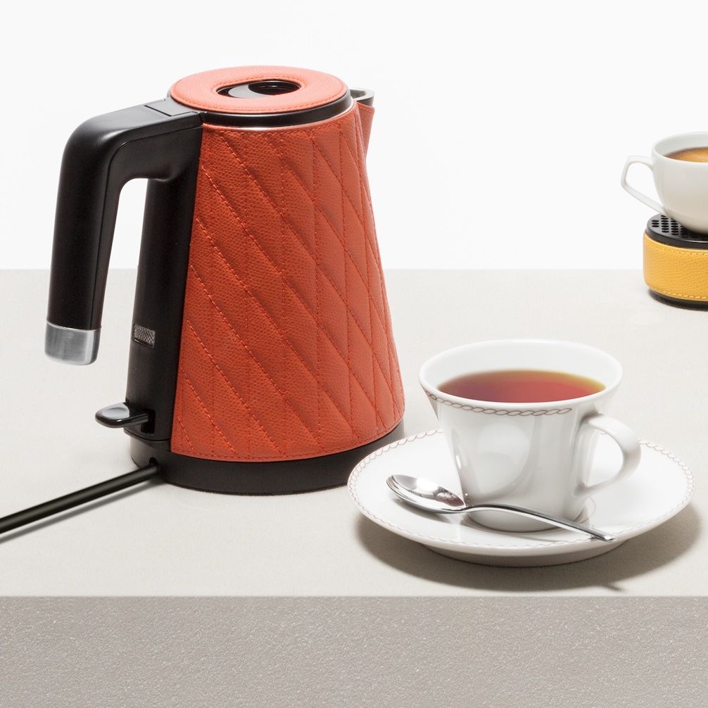 Leather-bound insulated stainless steel kettle with a diamonds quilt pattern that features a pour-through stopper and a removable head. Double wall stainless steel liner with vacuum. Head and handle in polished black pp and rotating base for multi-directional cup filling. Able to mantain hot or cold beverages’ temperature for up to 24hours.