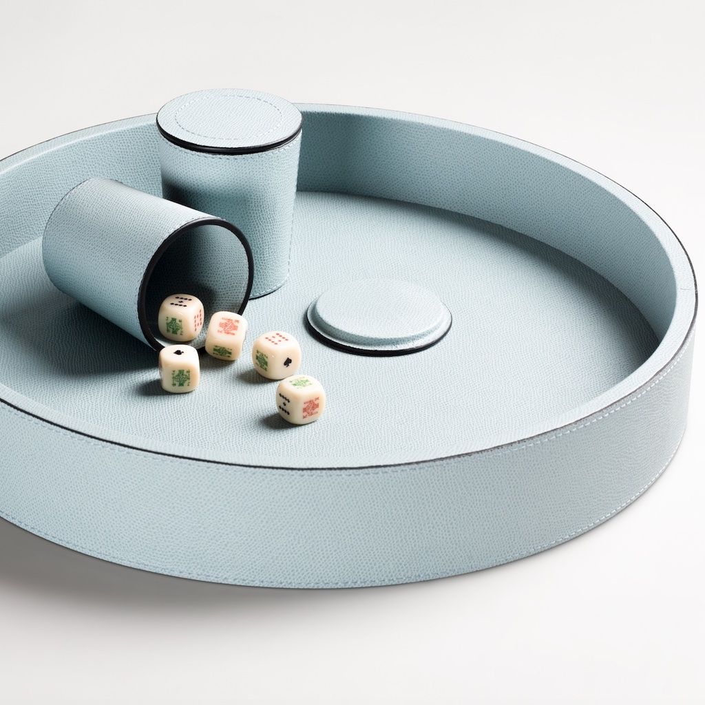 Handcrafted wood dice tray covered in leather and 2 leather dice cups.