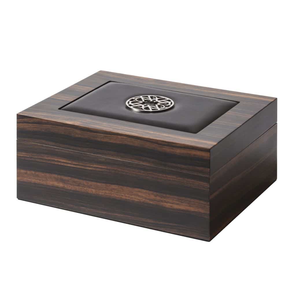 Macassar ebony cigar humidor with padded leather inlay featuring the embedded elie saabmonogram in polished palladium. Provided with cedar wood lining. Size: 30 x 24 cm – h. 13,5 cm