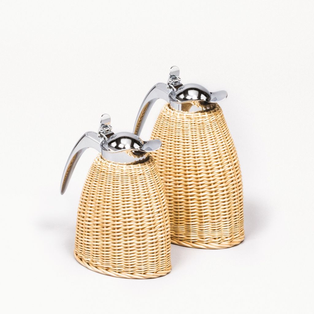 Insulated brass carafe with chrome-plated finish partially covered with fine willow. Two-chamber stainless steel structure able to maintain liquid’s warm temperature up to 12 hours and cold temperatures up to 24 hours. Precise pouring thanks to the specially developed hinged lid with one hand operation.