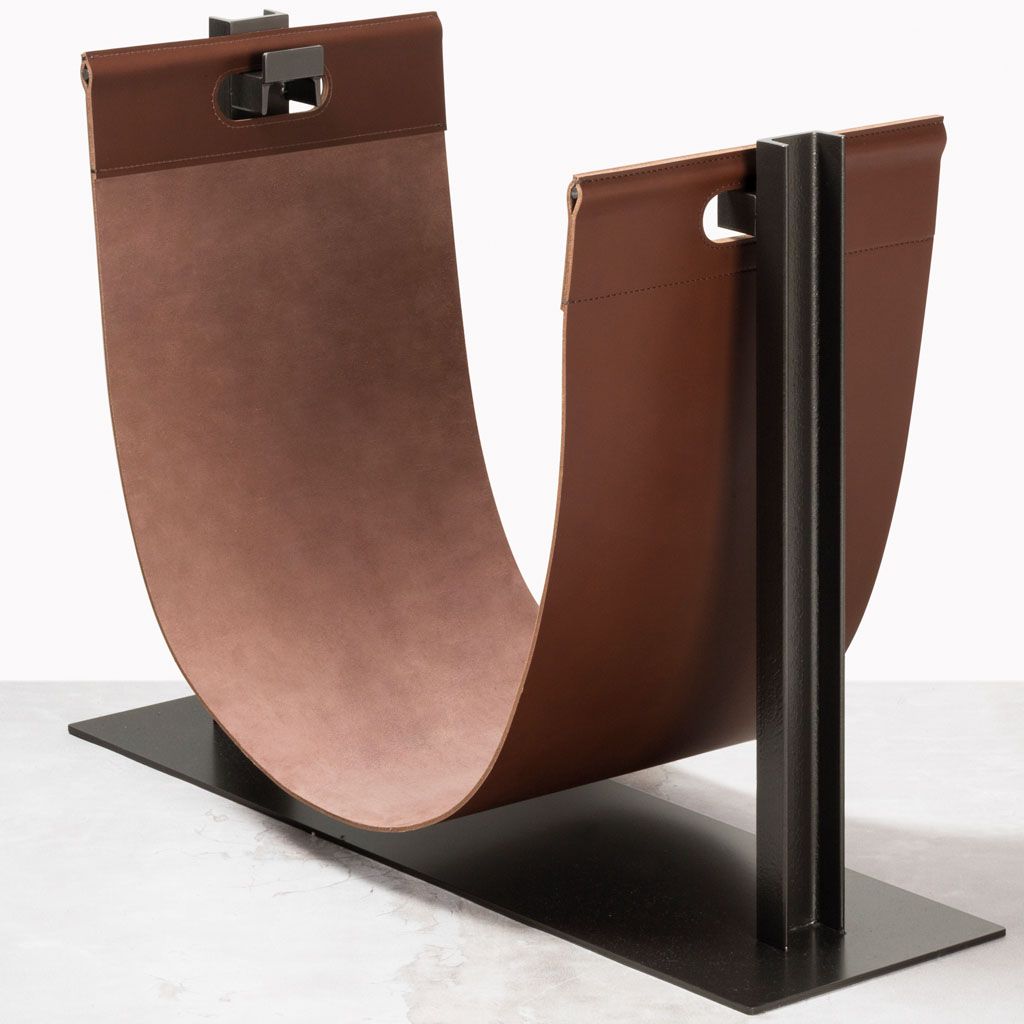 Saddle leather firewood carrier with handles. Metal support with bronze finish included.