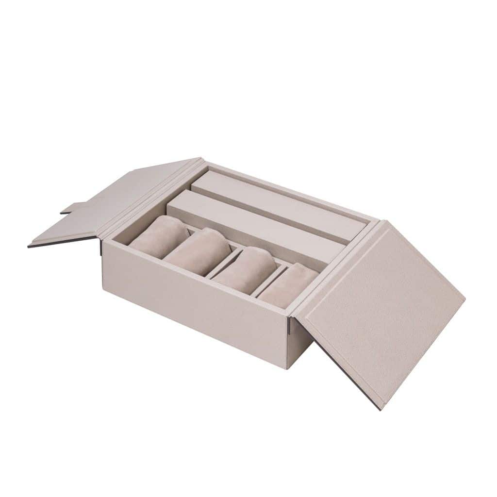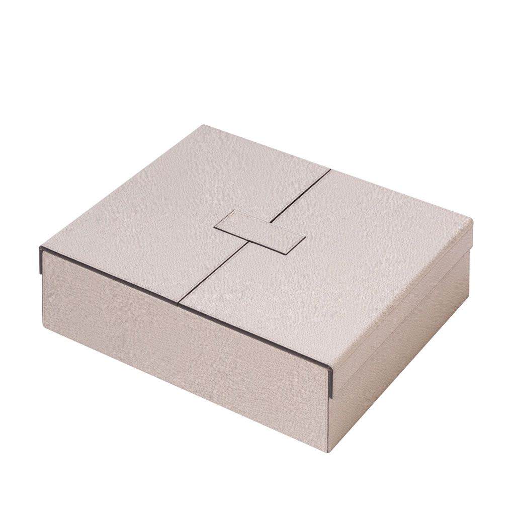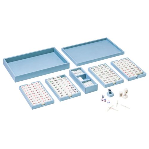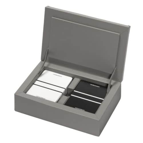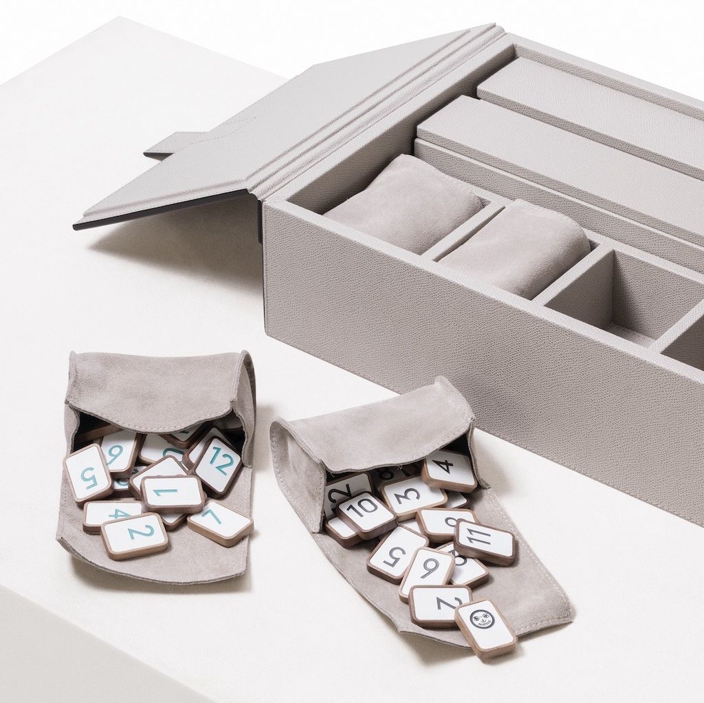 Leather covered wood case with magnetic closure. Includes a set of walnut tiles with white nappa leather inserts and bold-printed numbers stored according to color in four precious suede pouches.