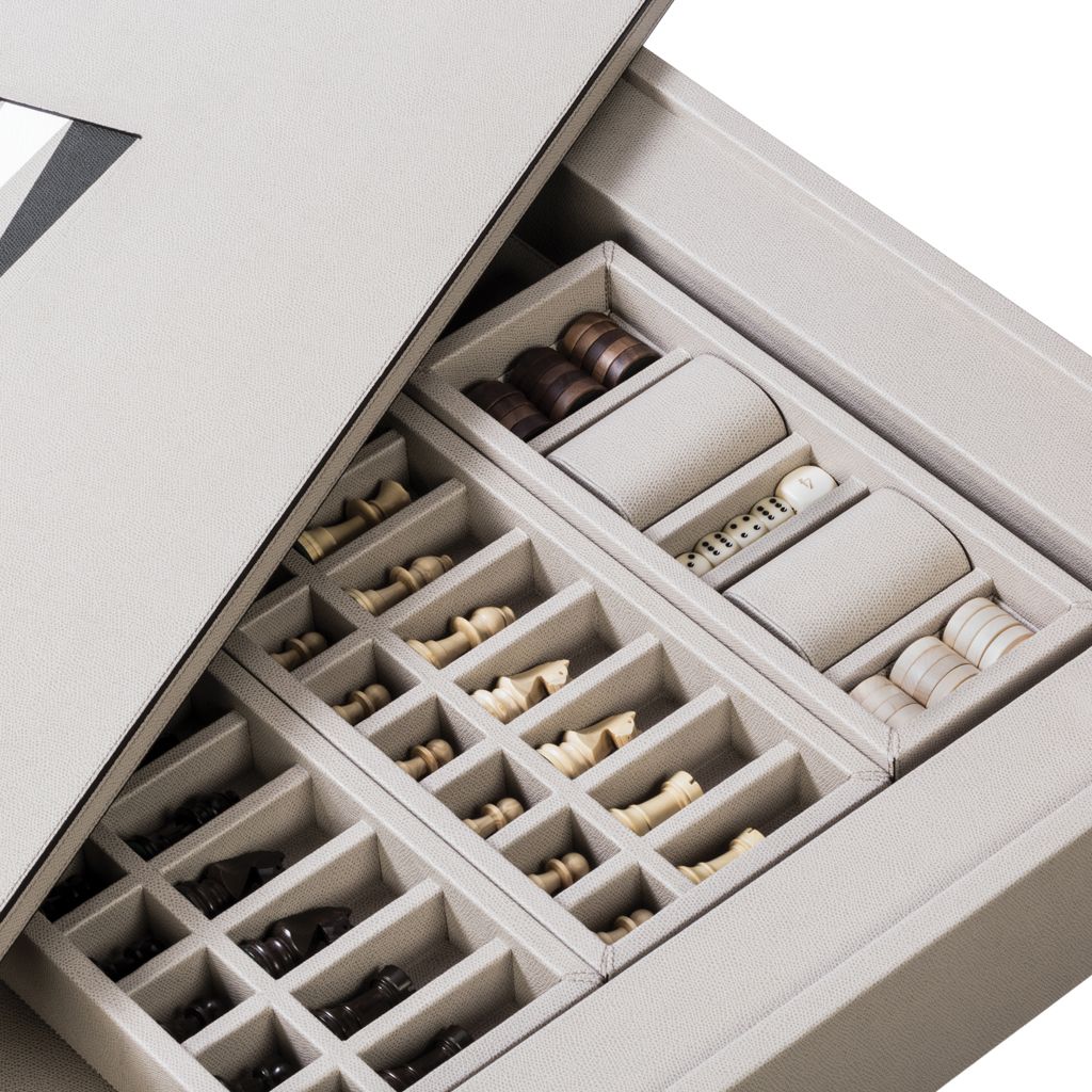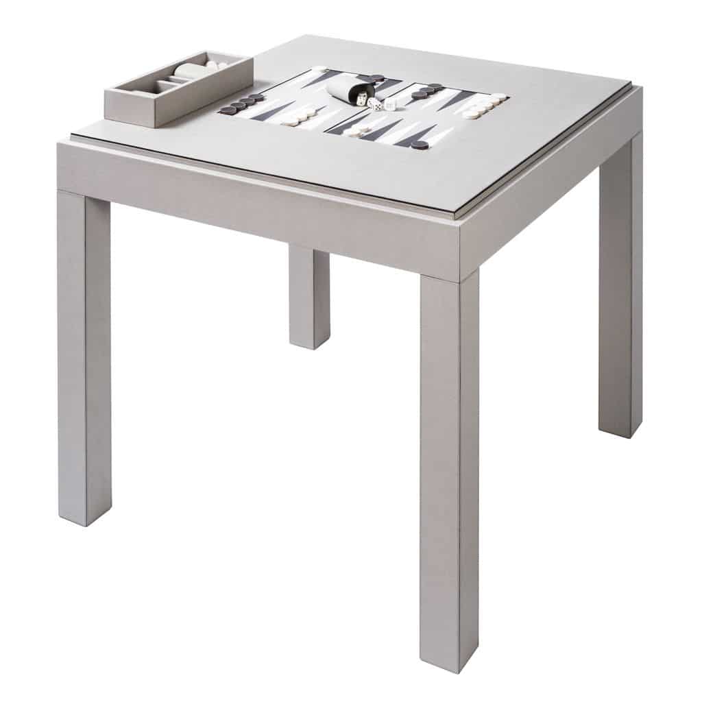 Leather covered wood structure with removable legs. Reversible top with leather inlaid backgammon playing field on the one side and inlaid chess board on the other. Under the top are concealed tree leather covered trays with compartments. Includes boxwood chess, maple and walnut backgammon powns with leather inserts, two dice cups, standard dices and doubling cube. Size: 85×85 cm – h. 76,5 cm