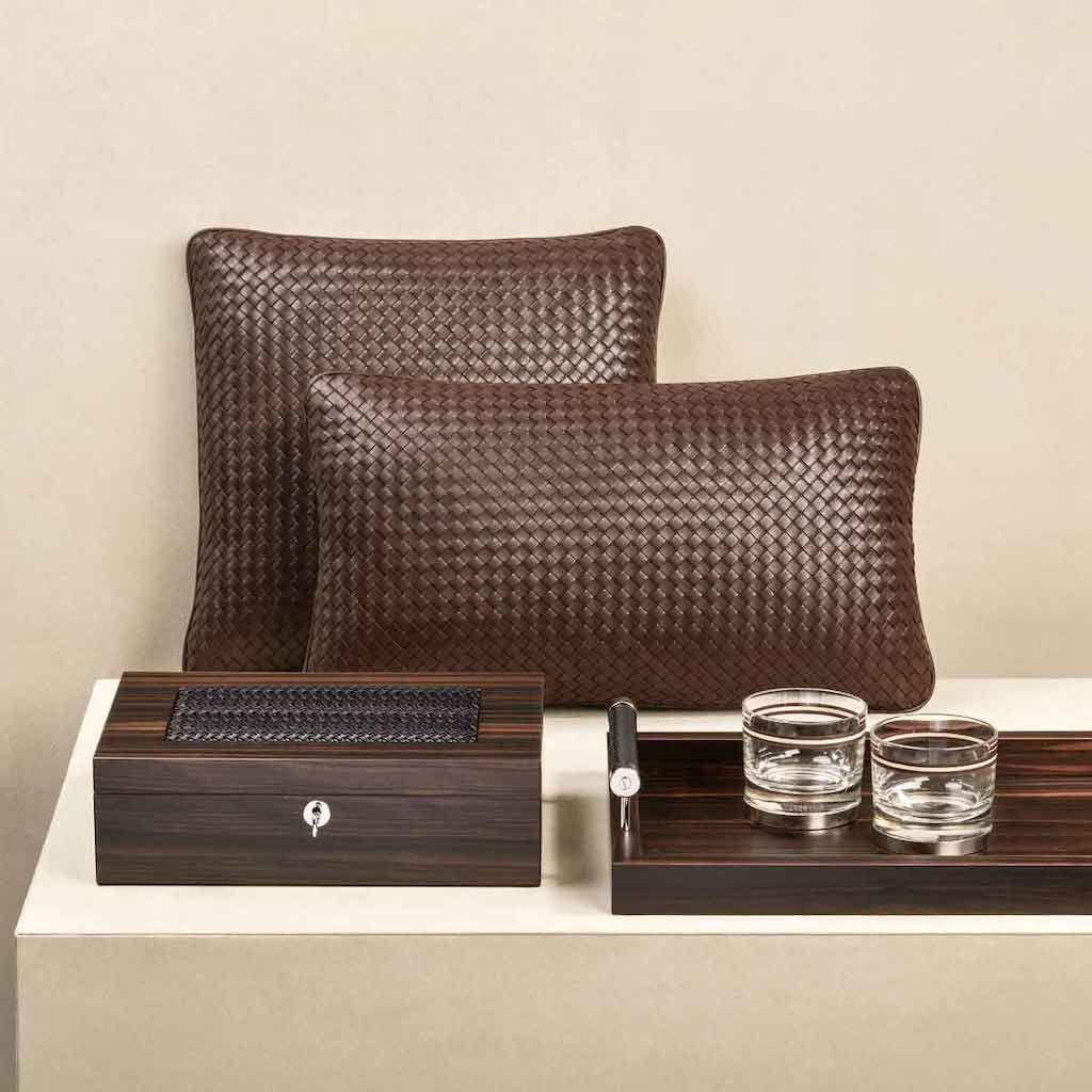 Leather cushion, handwoven finish.
