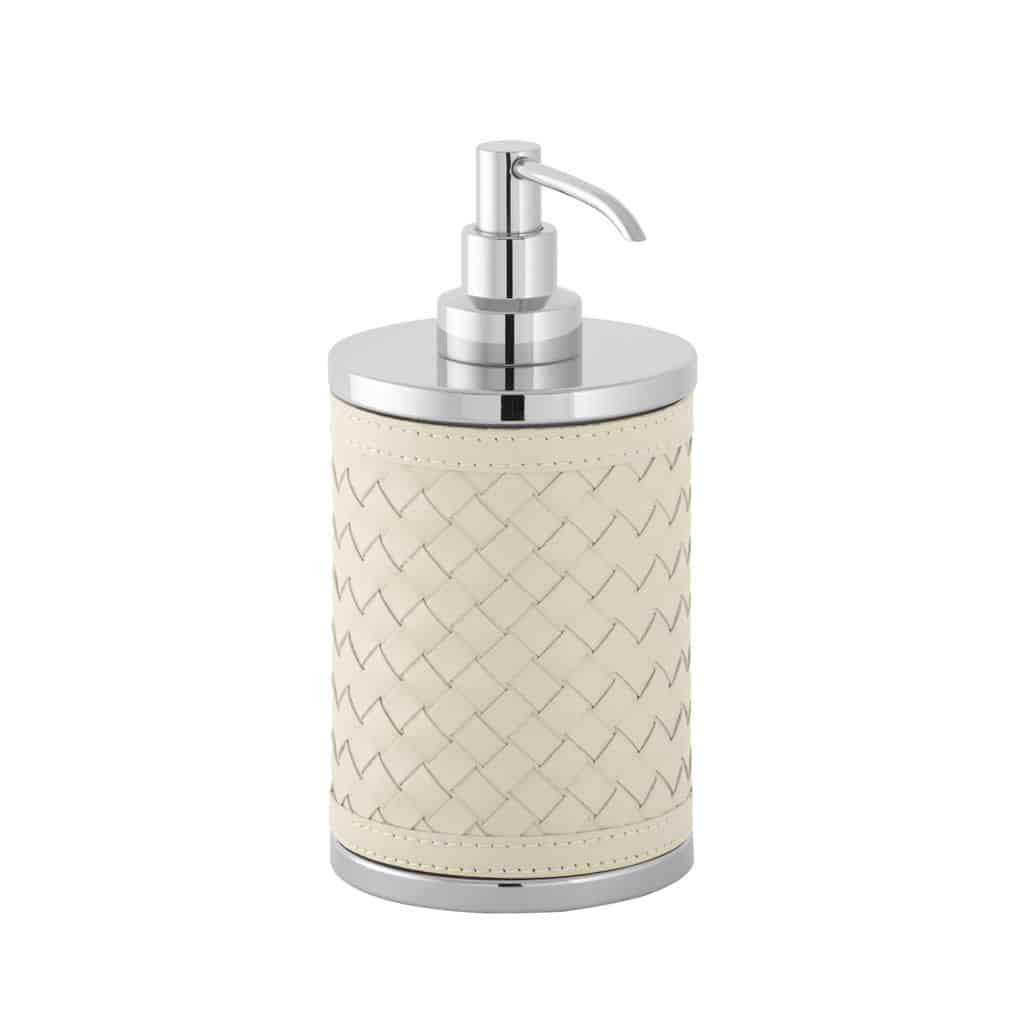 Soap dispenser covered with handwoven leather and boasts a chrome or gold metal finish. Different sizes avaialable.