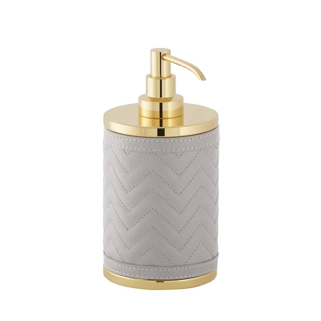 Soap dispender covered with quilted herringbone padded leather and boasts a chrome or gold metal finish. Different sizes avaialable.