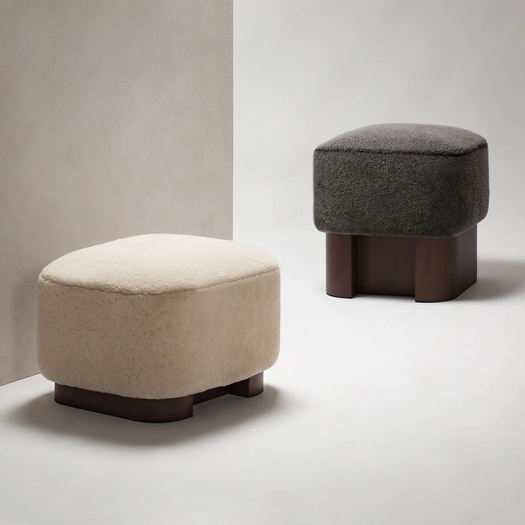 Materials: top in shearling, base in dark-stained canaletto walnut wood.