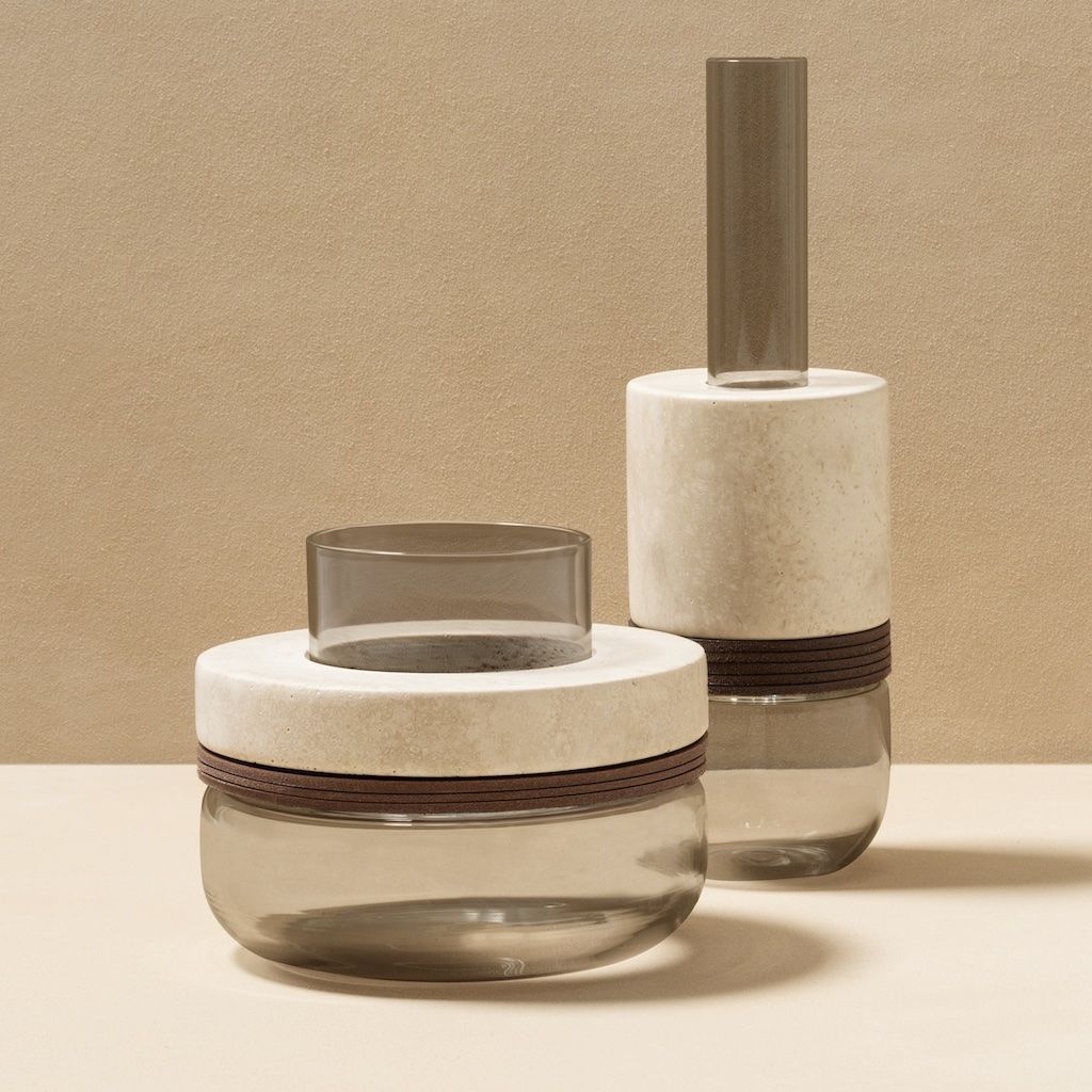 Blown amber colored glass and structure with saddle leather and travertine marble inserts.