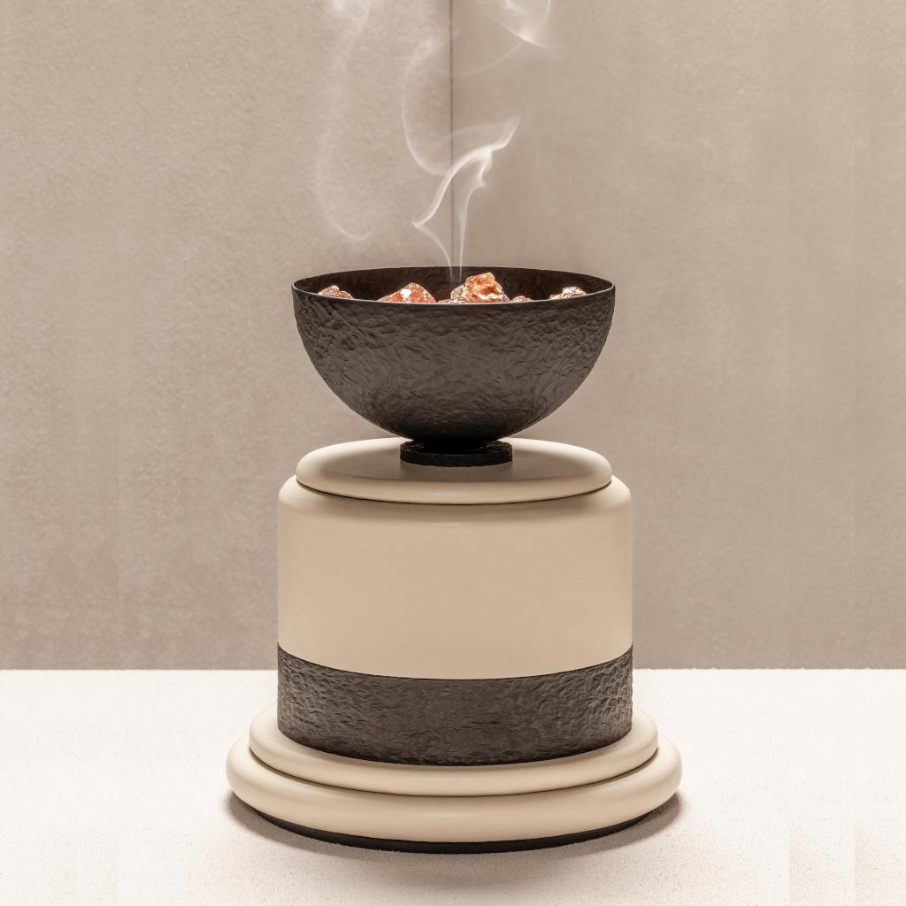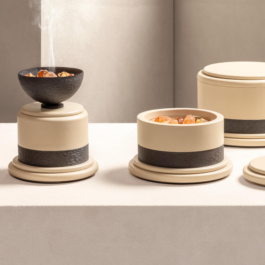 Dune takes form from gestures of use rather than from ceremony alone. Incense boxes, an incense holder are unified by smooth, rounded silhouettes, wrapped in leather and traced with accents of hammered, burnished bronze. The metal surfaces carry gentle irregularities, like dunes seen from above, marked by wind, softened by time, catching light with a warm, shifting depth. While conceived with Ramadan in mind, Dune speaks to moments of gathering, reflection, and hospitality, yet each piece moves naturally beyond a single occasion. The trays lend themselves to table settings and shared offerings; the incense elements become enduring accents within the interior, holding scent, memory, and atmosphere. Grounded in clarity of form and intent, the collection distills a slow, tactile, and enduring rhythm into pieces designed to be used, kept close, and revisited over time.