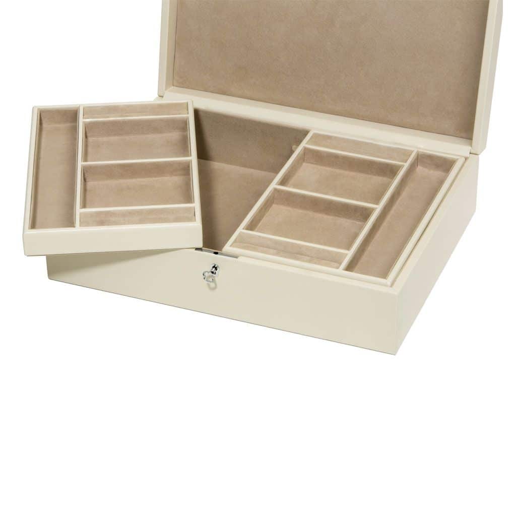 Leather jewellery box with ‘belt ‘ decoration, double removable tray, suede lining.