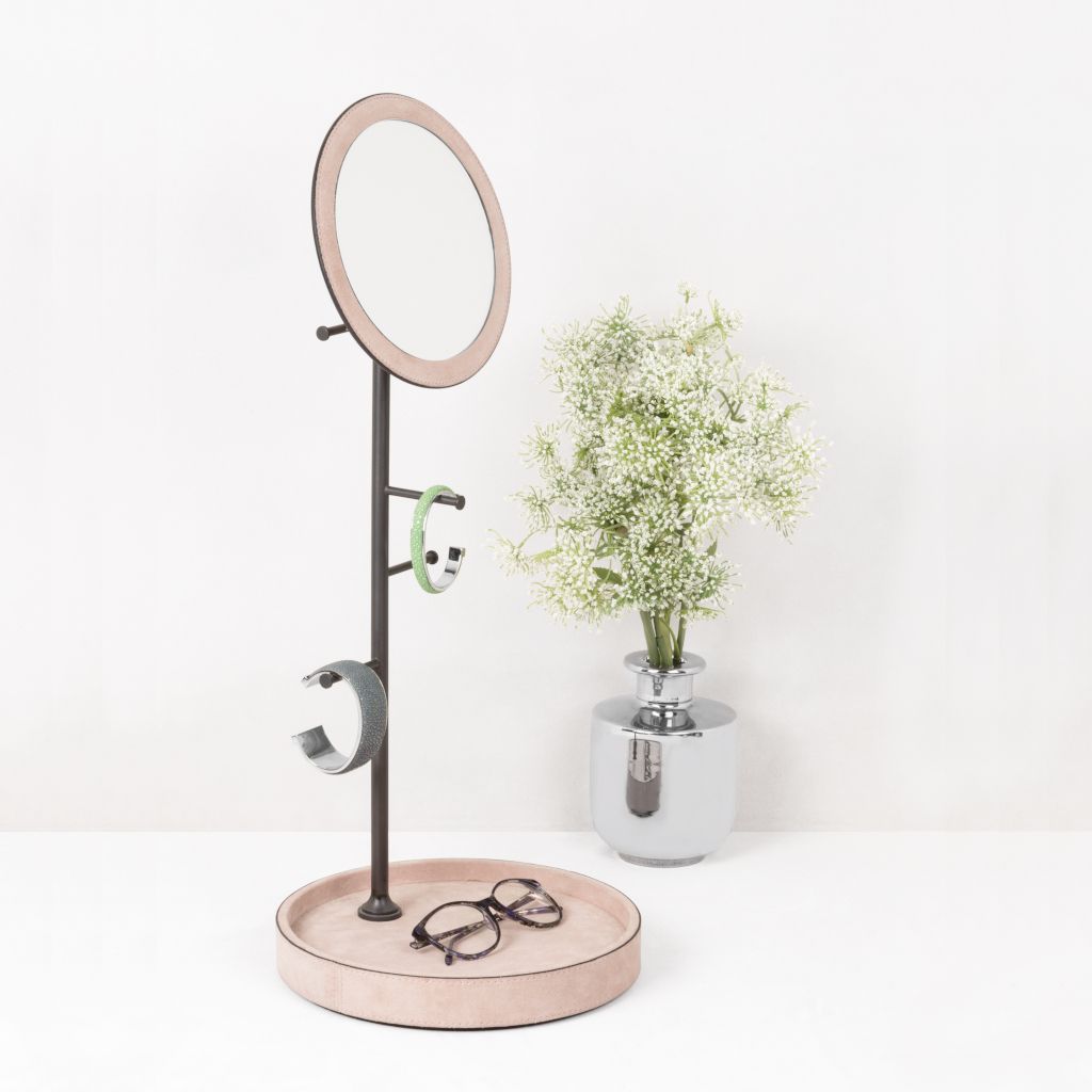 Metal structure provided with extensions to hang necklace, bracelets and rings. Top mirror with leather covered frame. Leather covered wood heavy base for stability with valet tray included. Different finishes available: brass, bronze, chrome.