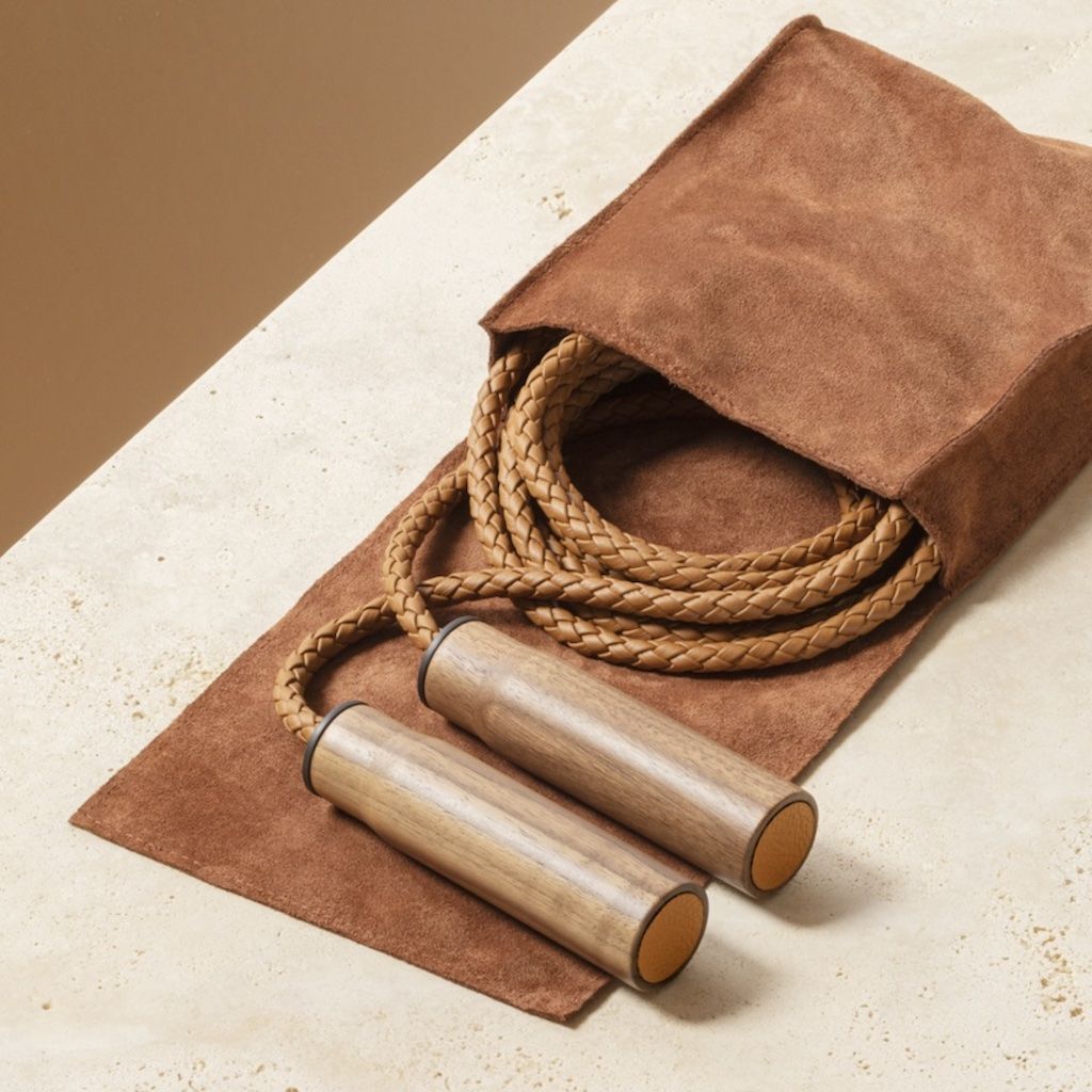 This jump rope is a sporty yet stylish accessory that can be used for both home workouts and as an eye catching decor thanks to the finely woven leather rope. Leather cord made of woven leather from the pelle Frau. Handles made of walnut wood featuring fine leather inserts on both sides.