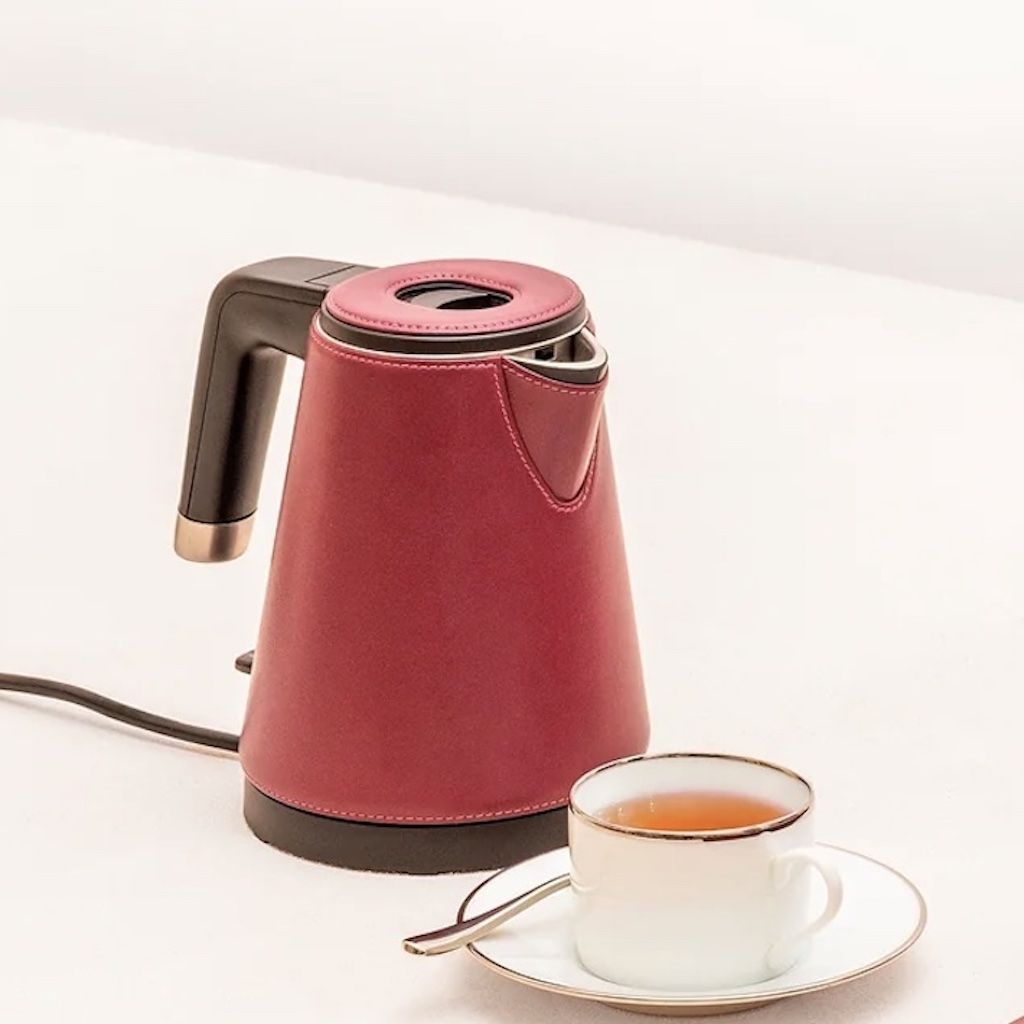Leather bound insulated stainless steel kettle that features a pour trough stopper and removable head. Double wall stainless steel liner with vacuum. Head and handle in polished black pp and rotating base for multi directional cup filling. Able to maintain hot or cold beverages’s temperature for up to 24 hours.