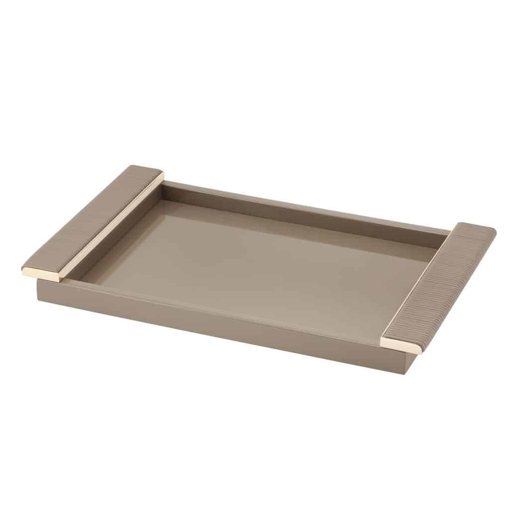 Lacquered tray with leather wrapped handles, chrome or gold details.