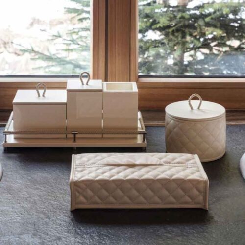 Lacquered tray with handwoven leather curved handles, chrome or gold details.