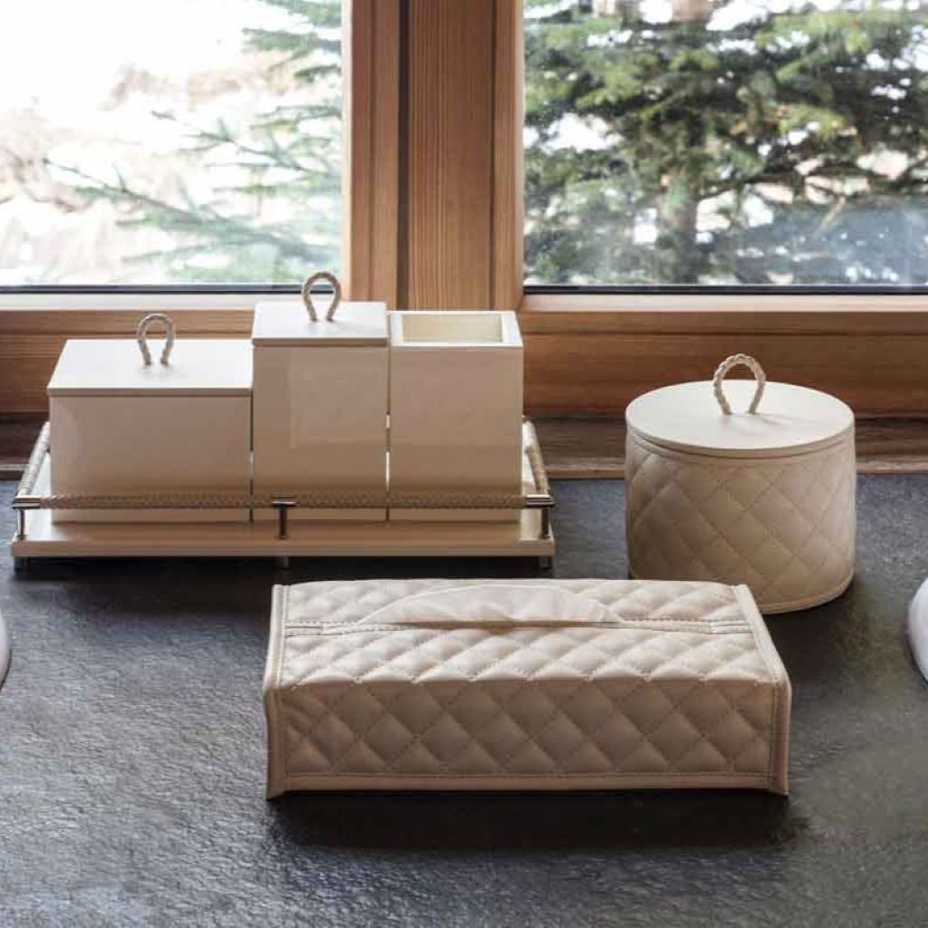 Lacquered tray with leather wrapped handles, chrome or gold details.