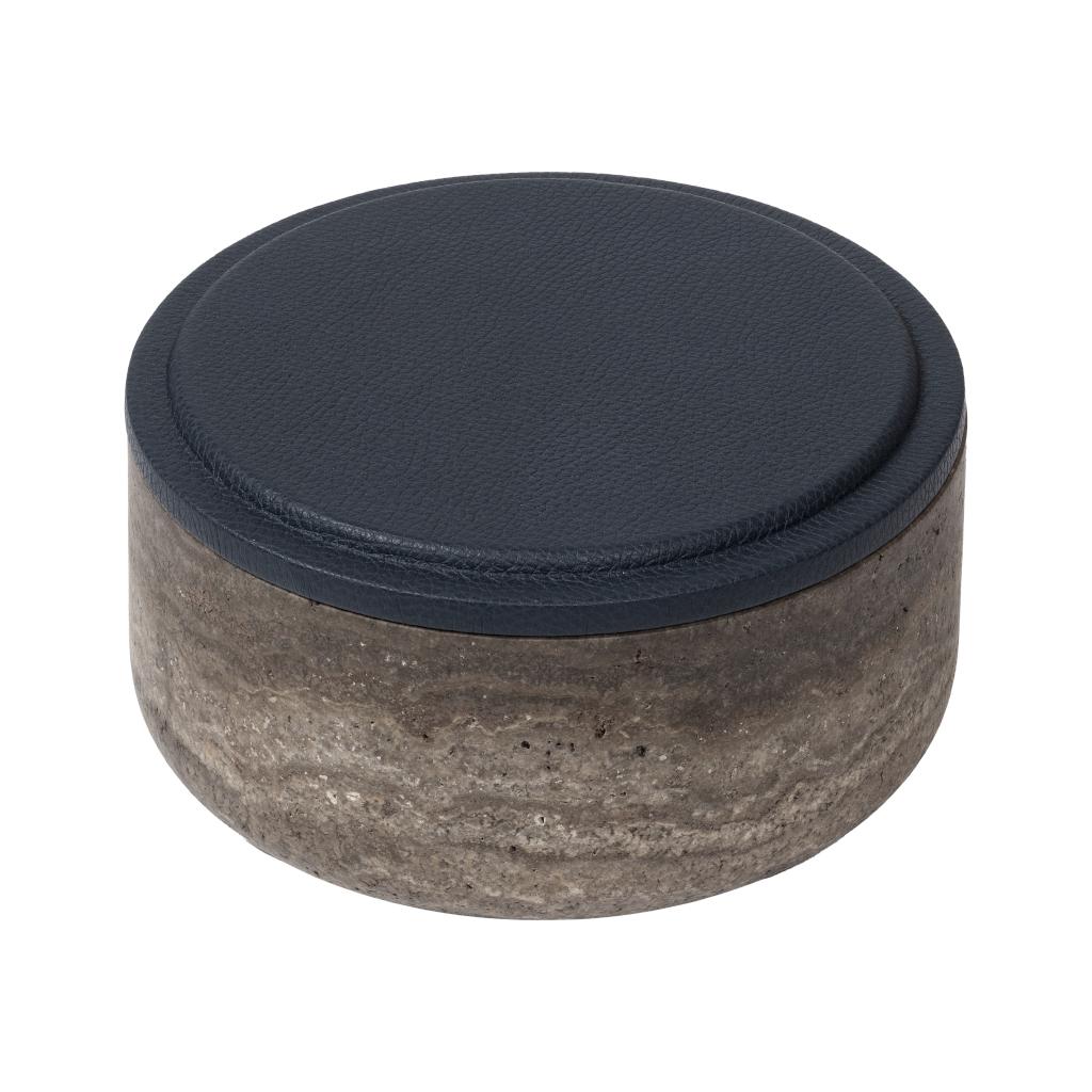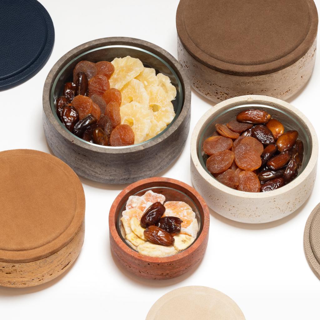Naxos is a series of travertine containers carved from a single, compact volume and defined by essential geometry. The rounded form, balanced in its proportions and softened by a radiused lower edge, reads as a measured volume, deliberate and quietly resolved. Each container houses a clear glass inner vessel intended for snacks, dry fruit, and similar edibles, introducing clarity and visual lightness at the core. A leather-covered removable lid completes the composition, introducing a tactile contrast to the mineral body.