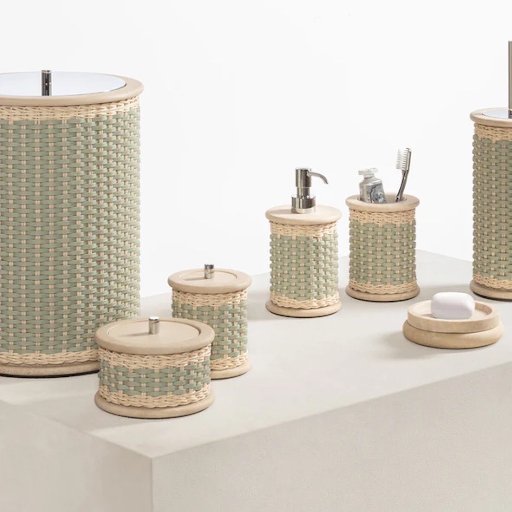 Crafted with meticulous attention to detail, this collection seamlessly merges the timeless allure of travertine with the warmth of woven leather and the organic charm of rattan. Metal finishes available: polished chrome, brushed brass and brushed bronze. Size: ø 10 cm – h. 13 cm.