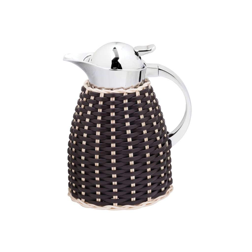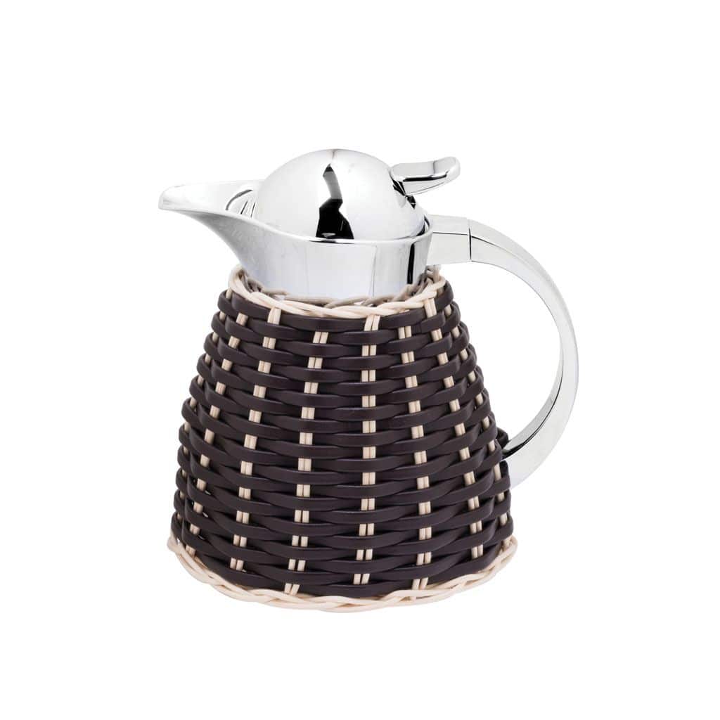 Partially leather and rattan covered insulated brass carafes with chrome plated finish. Two chamber structure able to maintain liquid’s warm temperatures for up to 12 hours and cold temperature for up to 24 hours thanks to the inner glass insert. Rattan available in natural color.
